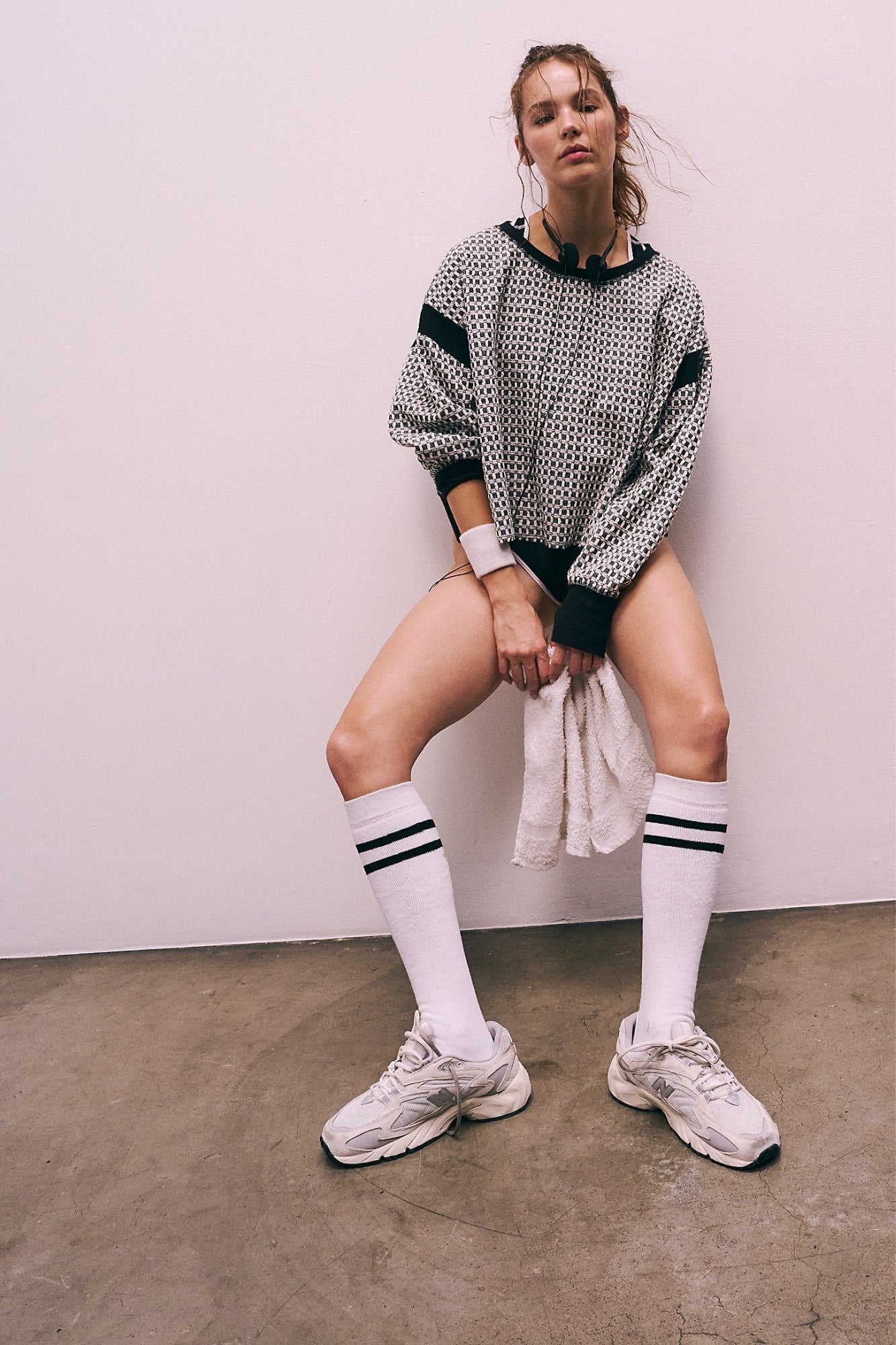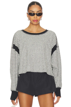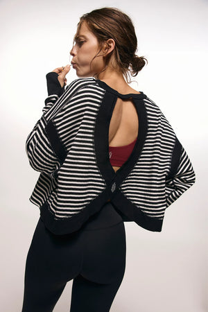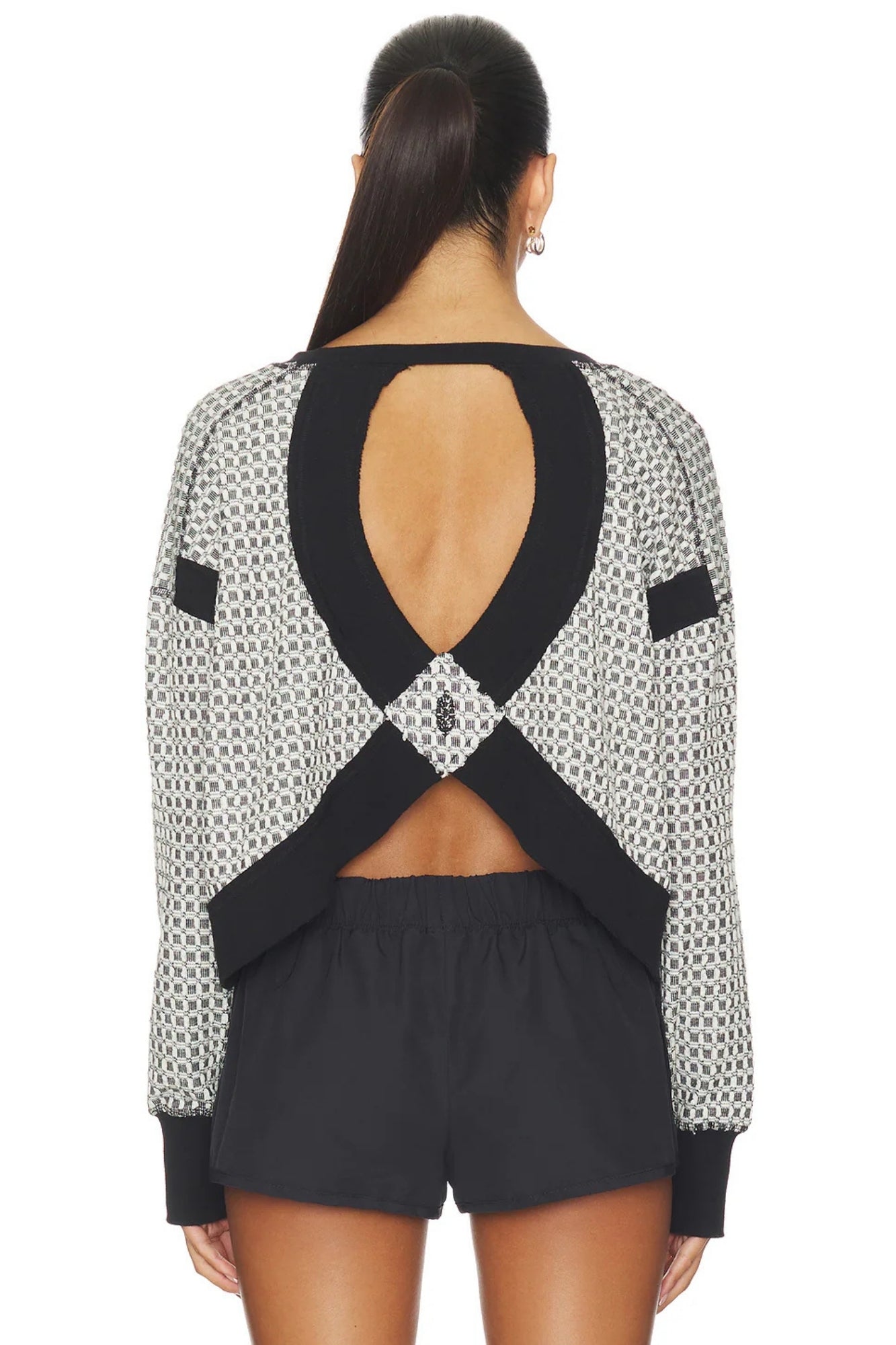 - Slight crop, longer sides; wide neckline; open-cut back; ribbed wrist detail