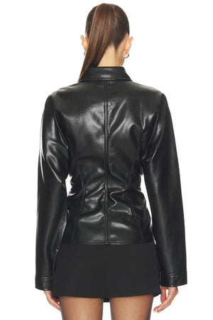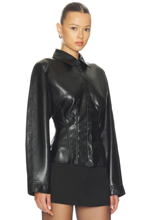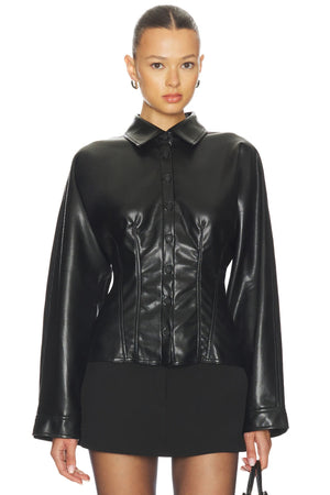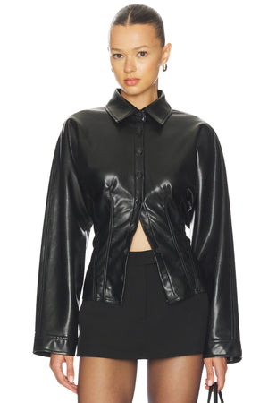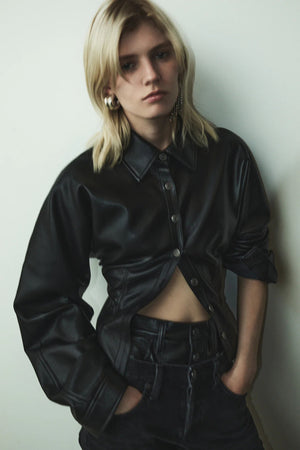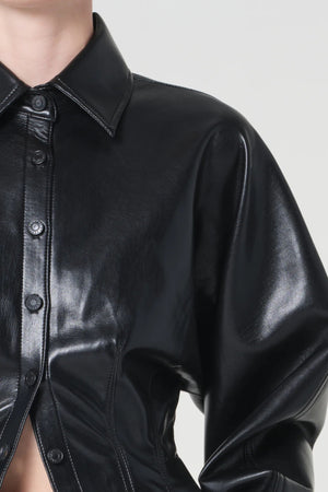 - A long-sleeve shirt crafted from soft, matte vegan leather with a subtle stretch