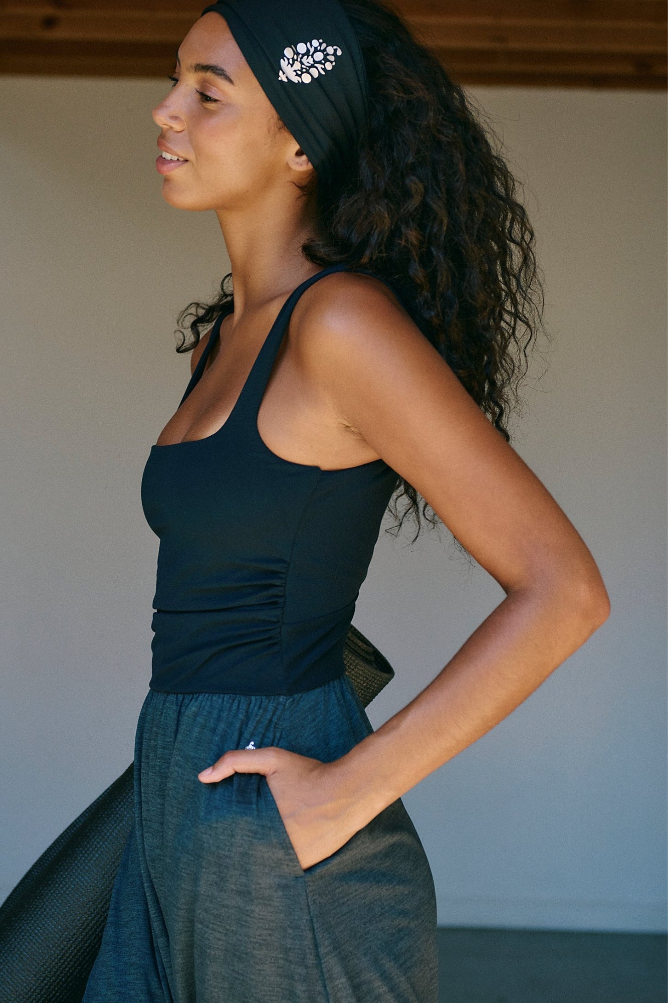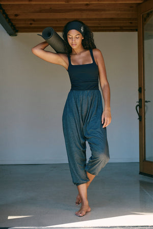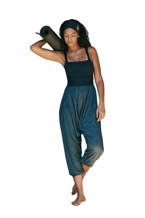 - Features: Fitted bodice offers low-impact support; four-way stretch upper; sweat-wicking; jersey fabrication bottoms; relaxed harem fit; subtle shine