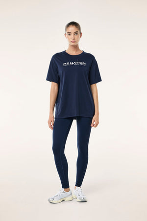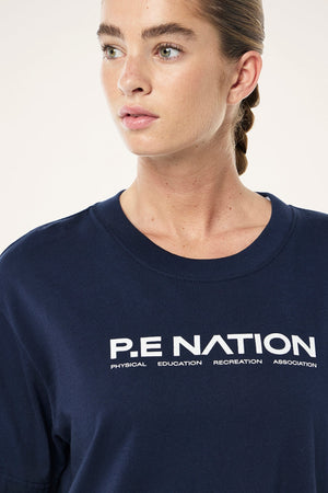 - This relaxed short sleeve tee features a ribbed crew neck and a custom P.E Nation graphic print. Style this tee with a track pant, leggings or bike short for laid back days.
