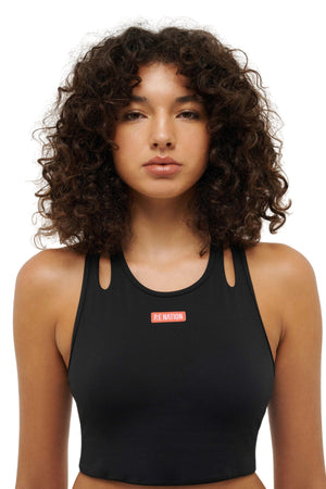 • A low-support sports bra with longline silhouette and laser-cut detail at shoulder.