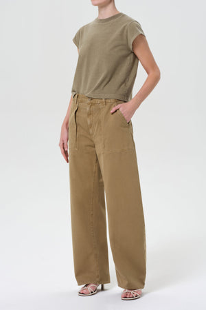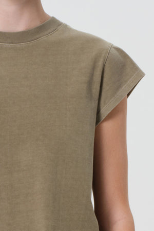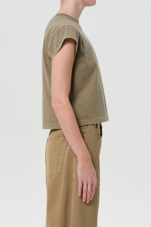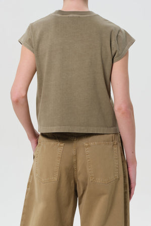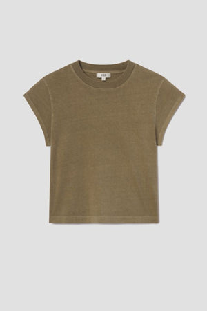 - Looks Like: Light dusty sage crewneck tee with cap sleeves