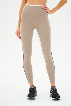 - Alternating pops of white and latte color along the waist, inner and outer leg inspire a sense of spontaneity in this dynamic run tight.