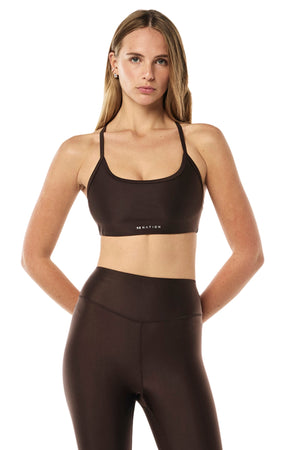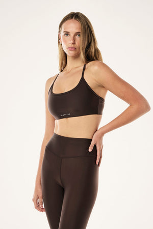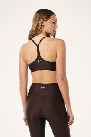 • The Fairmont Sports Bra in Espresso is made from our signature PWR Shine fabrication.