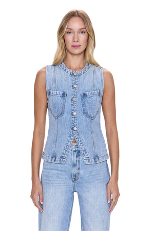 - The GIA Vest is crafted from our premium rigid denim, engineered to maintain its striking shape and structure wear after wear.