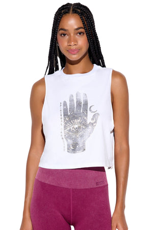 • The Spirit Crop Tank channels empowering affirmations, with a gold foil embellished incantation graphic and lived-in, vintage feel.