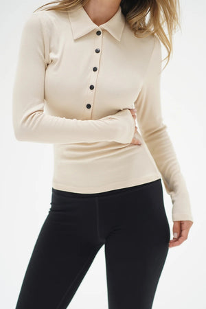 - Kylee is a 2x1 ribbed long sleeve with a collar and snap front.