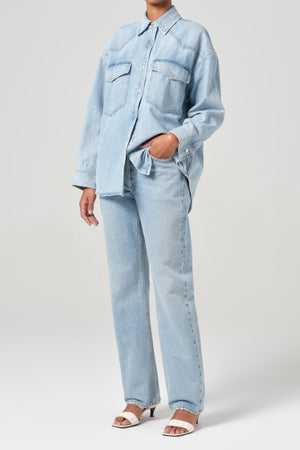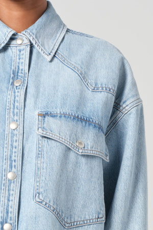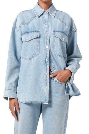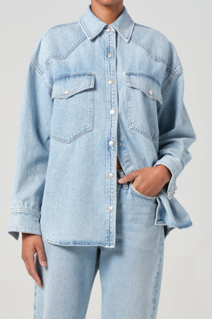 - Looks Like:Â Light marbled indigo denim long sleeve button up with pointed collar