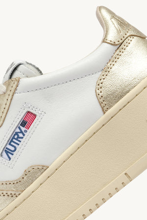 - All the signature elements remain unchanged: it's crafted from supple white leather with laminated platinum-tone details, perforated for breathability, and branded with Autry logo on the side.