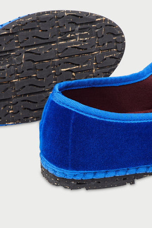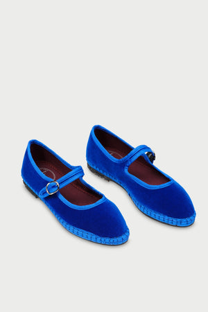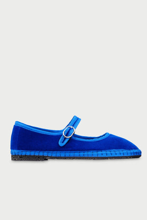 • Velvet mary jane in blue with blue piping and buckle closure.