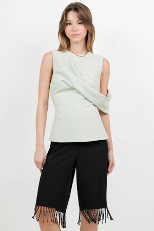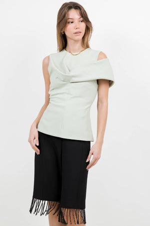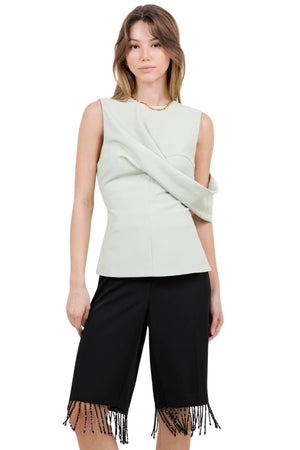 SOFT WOVEN DRAPE DETAILED SLEEVELESS FITTEN SAGE TOP