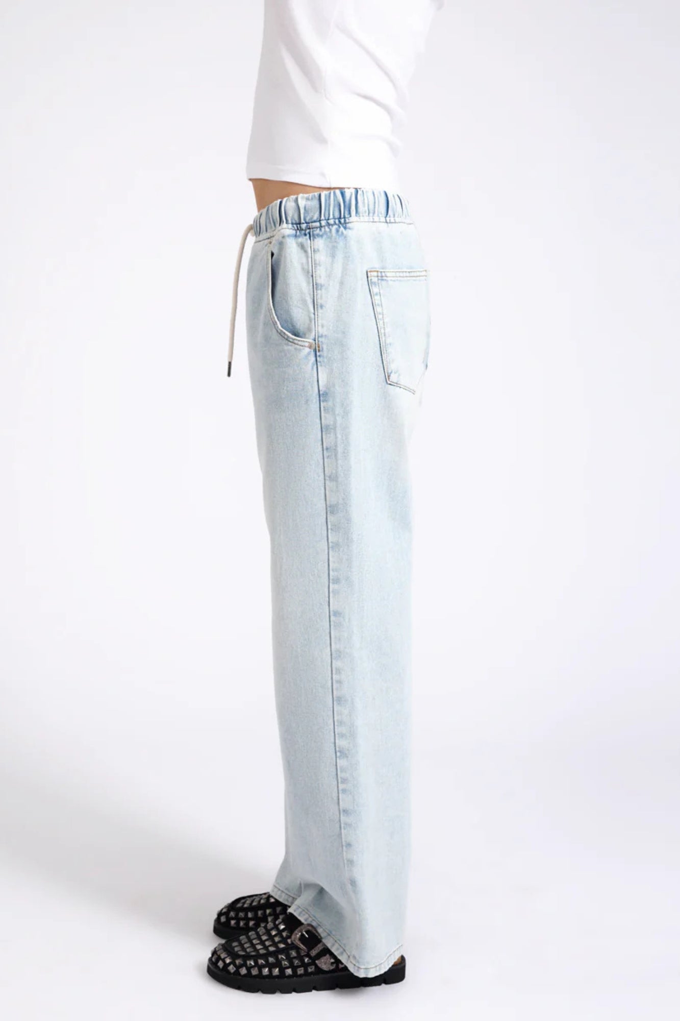 - Designed with a mid-rise fit and wide legs, these denim jeans feature an adjustable drawstring waist for comfort and attitude