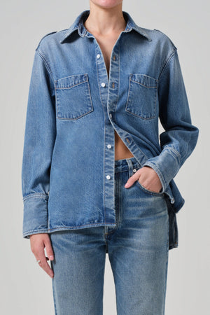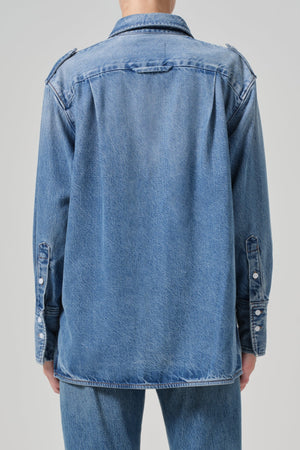 - Relaxed shirting with utility inspired patch pocket details and shoulder flaps.