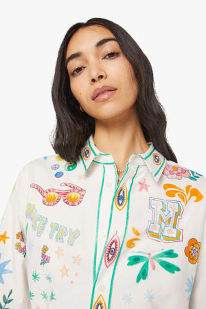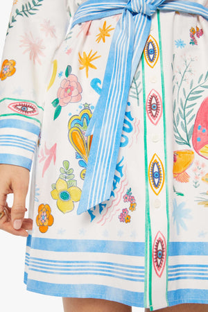 • A button-up dress with drop shoulders, a tied waist and a curved, thigh-length hem that's slightly longer in the back