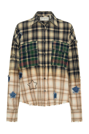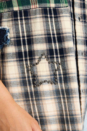 • The Cream Blue Check Flannel Star Studded Shirt takes a classic flannel silhouette and amps it up with rebellious detail