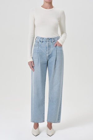• Looks Like: Clean pale indigo with pleat detailing