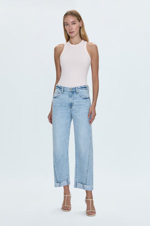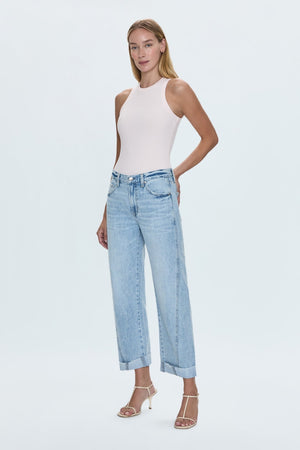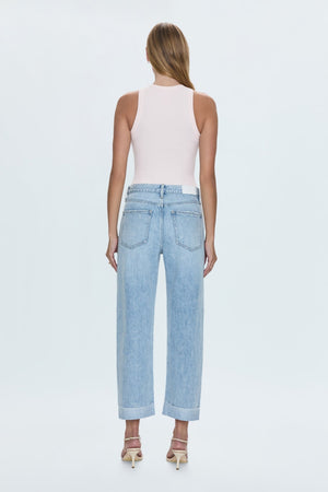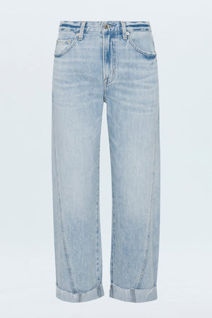 - The light denim wash and cuffed hem offer a versatile look that can be dressed up or down, while the seaming detail creates a subtly elongated figure.