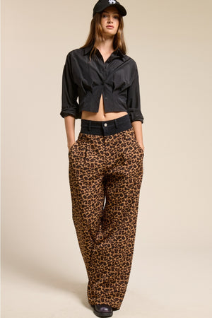 LEOPARD PRINT WIDE LEG PANT WITH DENIM WAIST