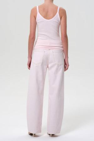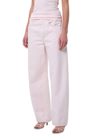 - Crafted from light pink denim, it offers a unique, worn-in look while maintaining a fresh, contemporary appeal.
