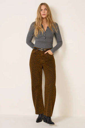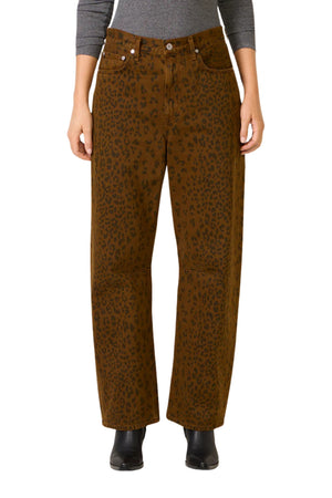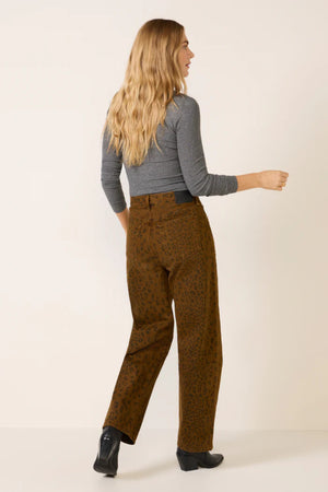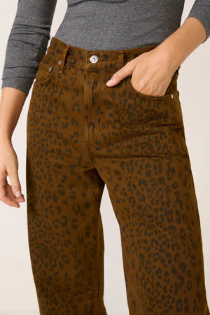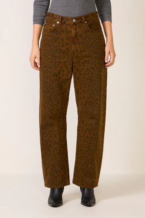 • Looks Like: Dark brown denim pant with black cheetah print detailing throughout