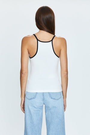- Ribbed binding at neckline and arm holes. Le Blanc with Noir is our staple white colorway adorned with contrast ribbing.