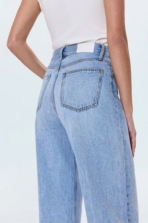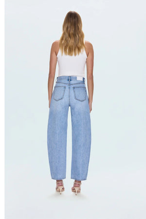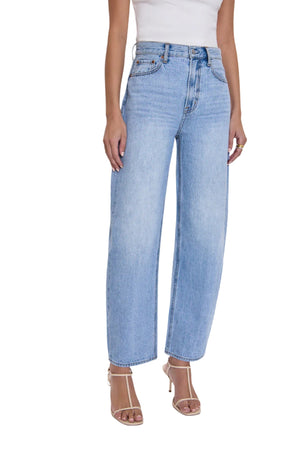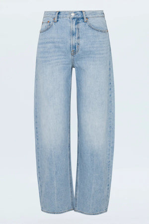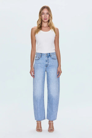 • These jeans feature a flattering high-rise waist and a full-length 30" inseam, leading to a stylish barrel leg silhouette.
