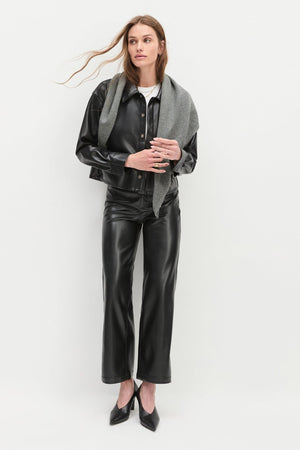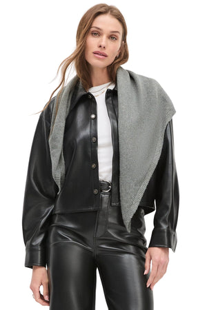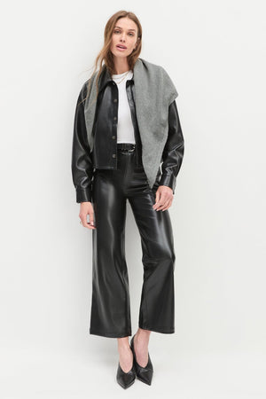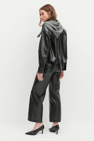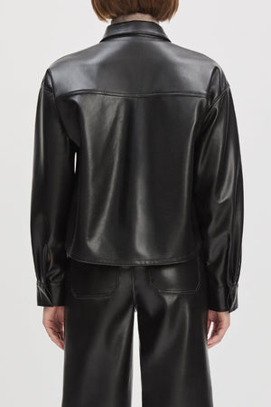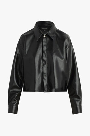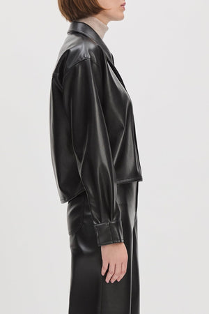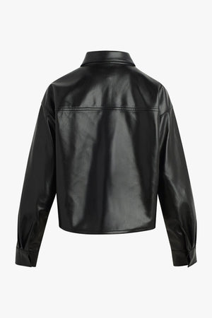 • The Brady Crop Shirt in vegan leather is designed for a loose, oversized fit that hits just below the waist for the perfect untucked look.
