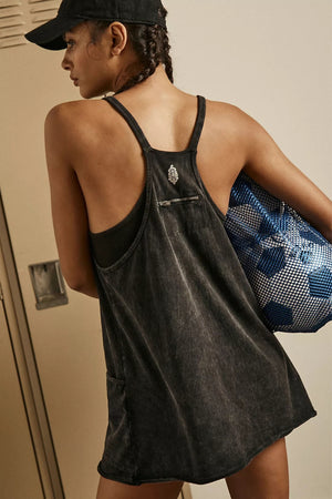 - Features: Soft fabrication, lightweight design, scoop-neckline, thin shoulder straps, racerback detail with zippered pocket, oversized patch pockets at front, lined interior with shorts piecing at bottom
