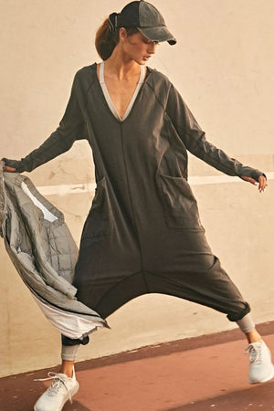 • This versatile onesie features a hooded neckline, thumbholes at the sleeves, and oversized patched pockets for a relaxed and comfortable fit.