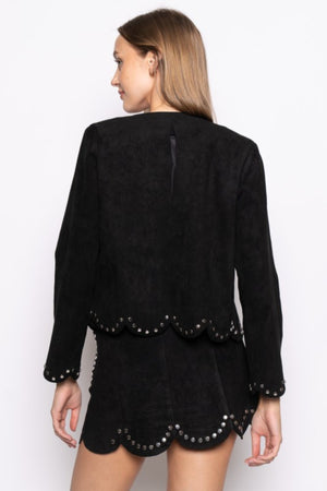 SUEDE STUDDED DETALIED SCALLOP HEM MINI SKIRT JACKET SET