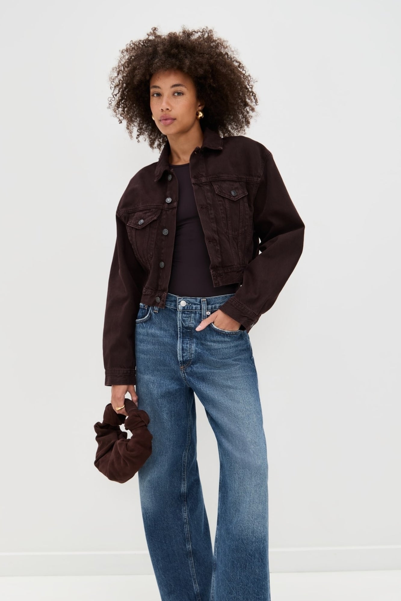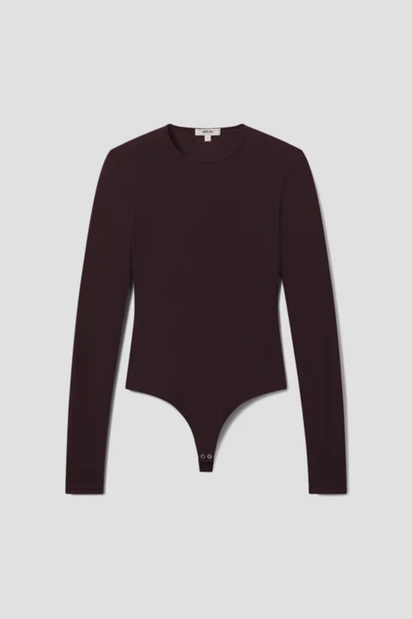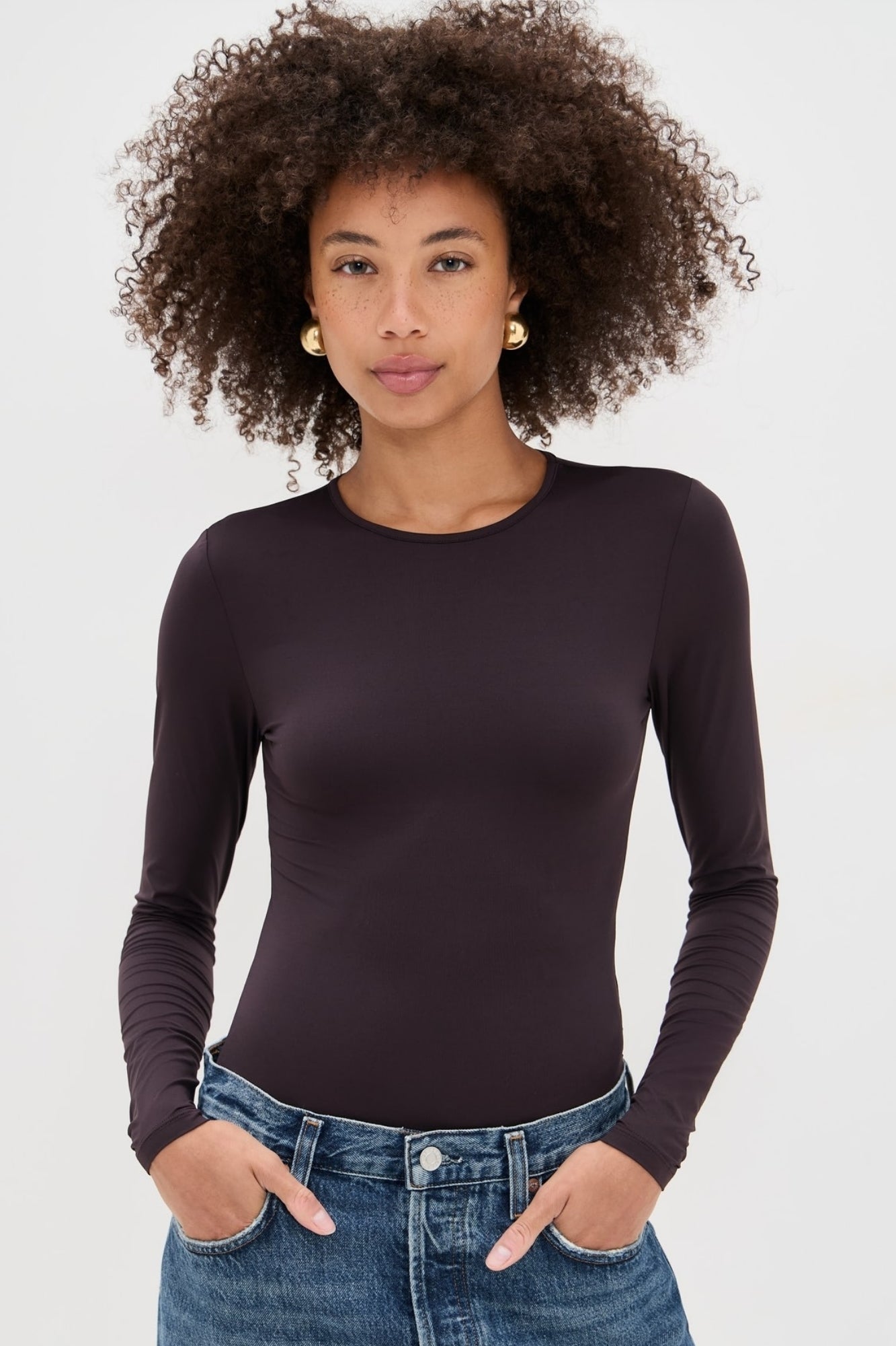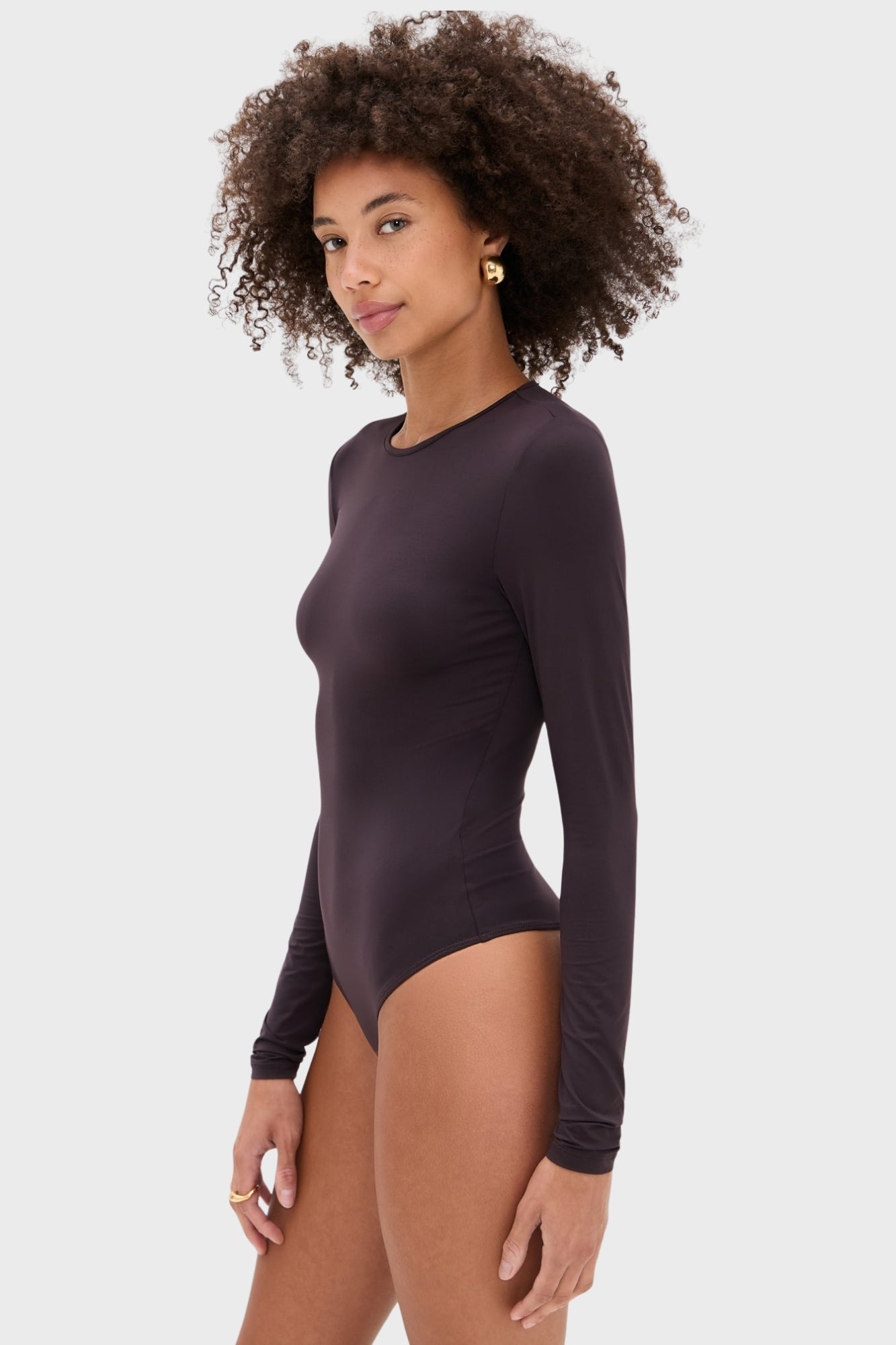• The Aura Long Sleeve Bodysuit in Chocolate is a dark brown crewneck made from a lightweight, second-skin fabric.