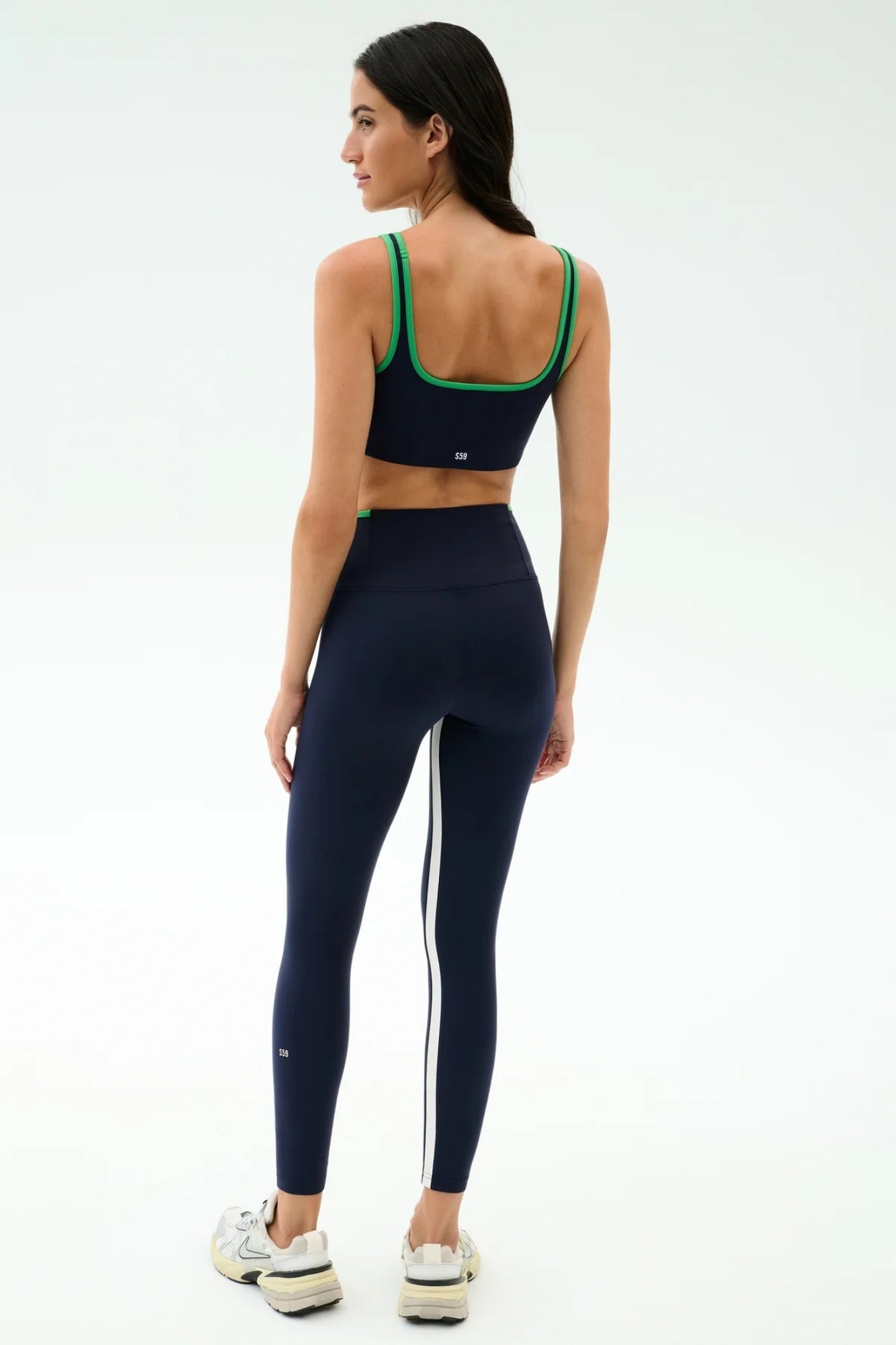 - A supportive sports bra with a square neckline outlined in contrast color trim