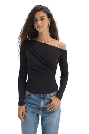 - Panama is an asymmetrical off the shoulder long sleeve with side gathering. This top is made in a shine 2x1 rib fabric that has a slight sheen to it.