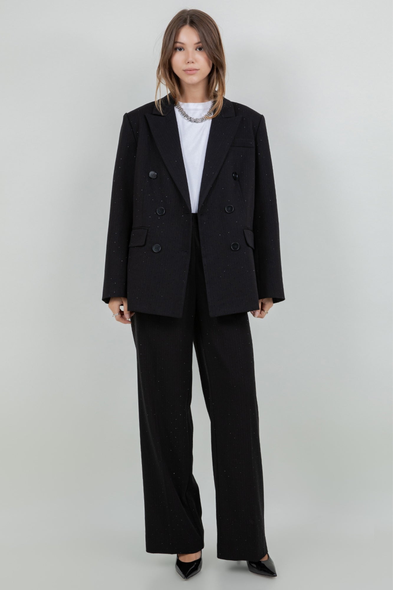RHINESTONE EMBOSSED BLACK PINSTRIPE PANT