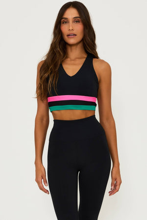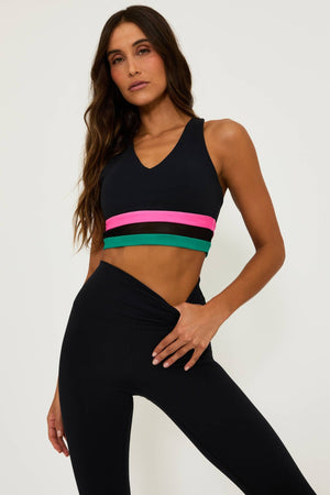 - Color block bands under the bust with mesh detail