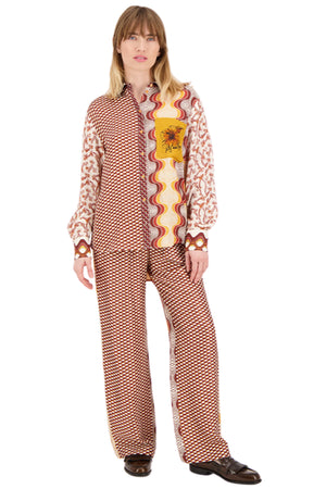 - Front of the shirt is done in different geometric blocks in tans, oranges and browns.