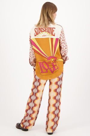 - Back pockets have a flower on one; the other reads “HERE COMES THE SUN”.