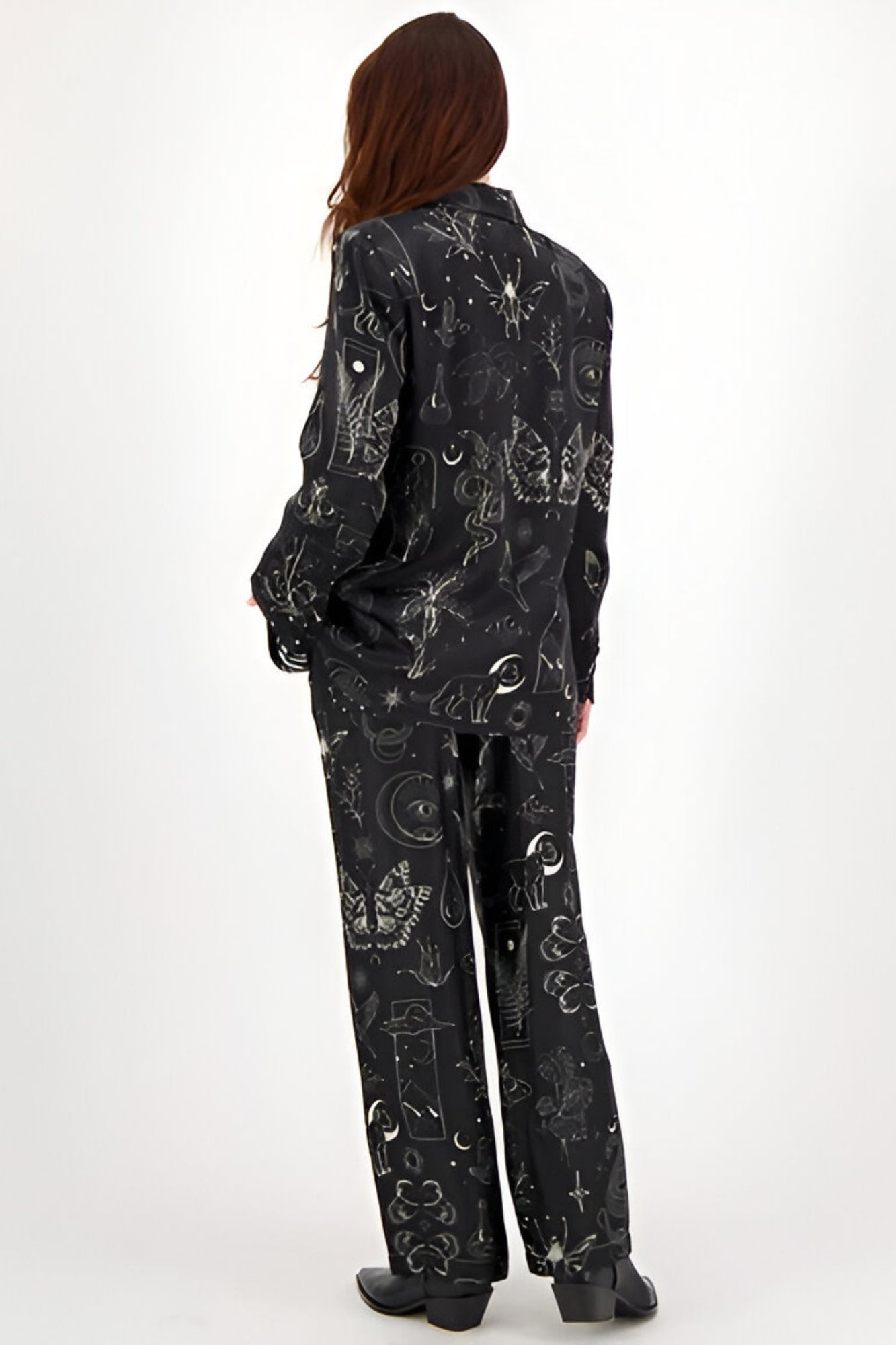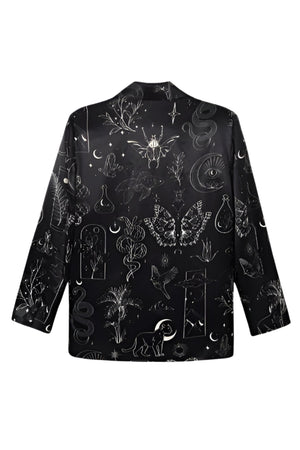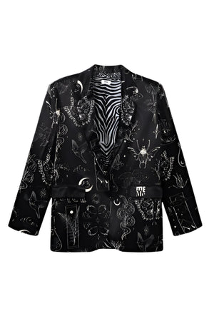 - Black blazer with collar and lapels in our Black Magic print with ornate designs in white.