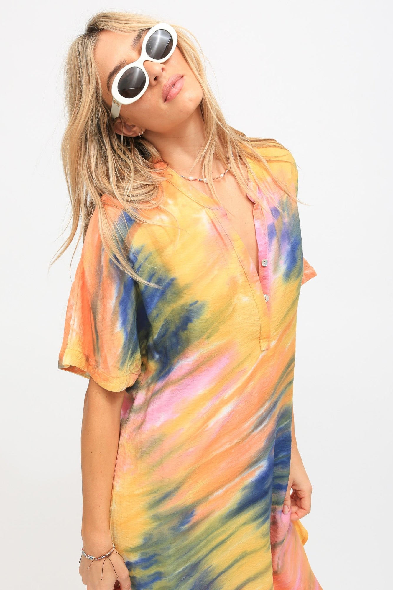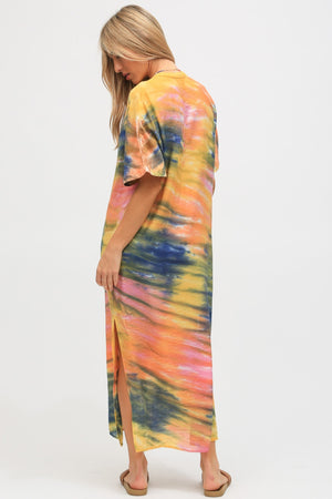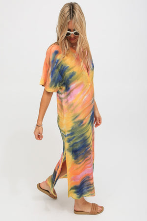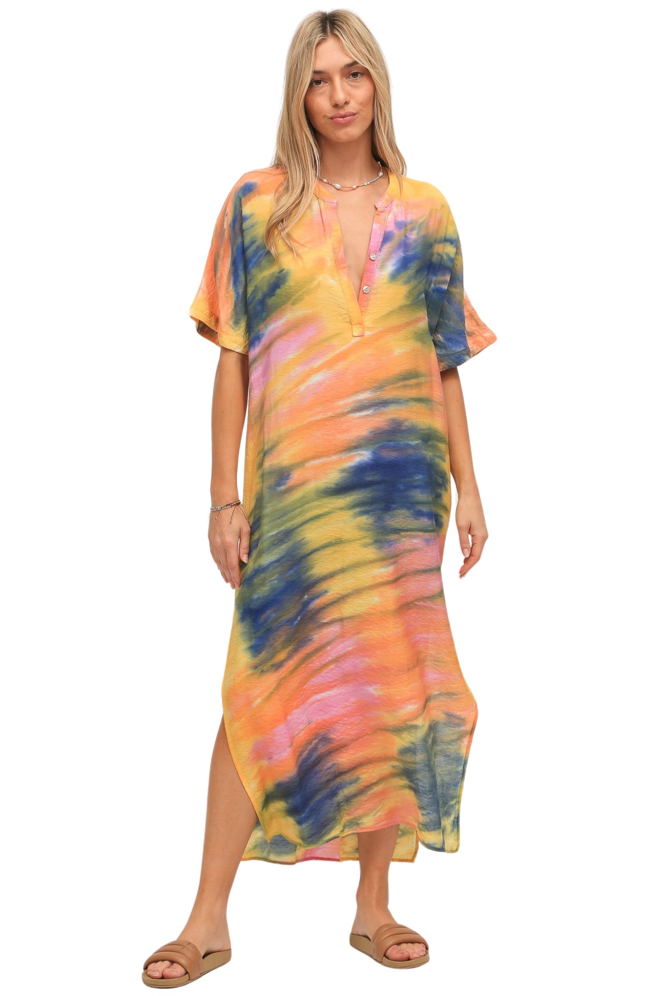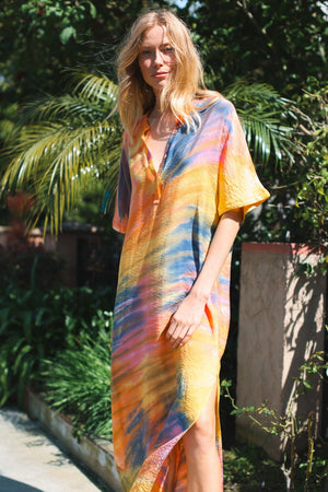 - The Montauk Kaftan features a hand dyed wash inspired by summer sunsets and is the perfect loose fitting long dress with slide slits on both sides.