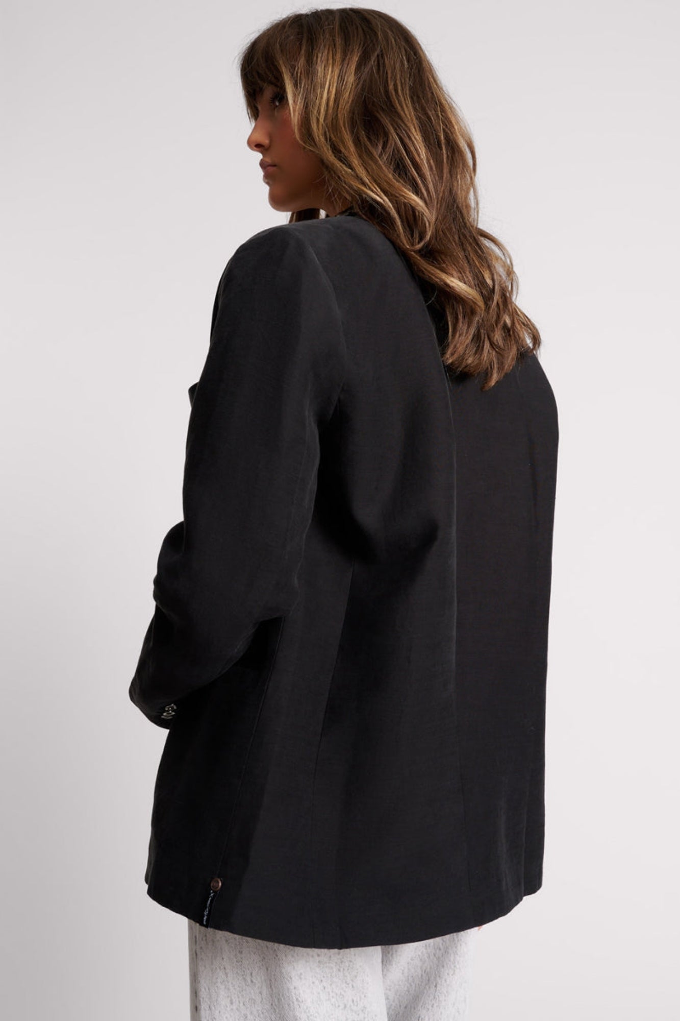 - Classic black linen blend base; accented by a leather-look lapel and collar.