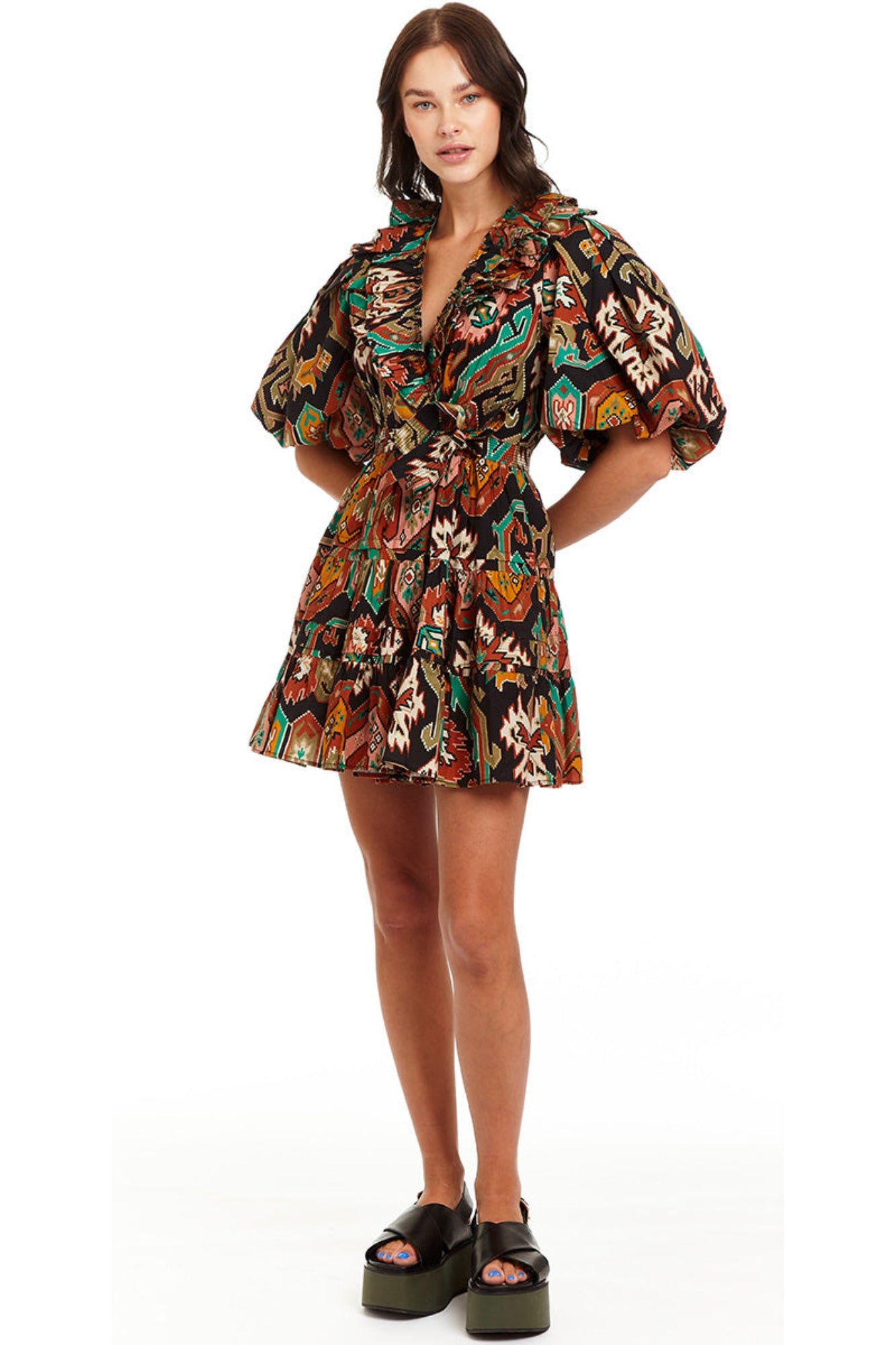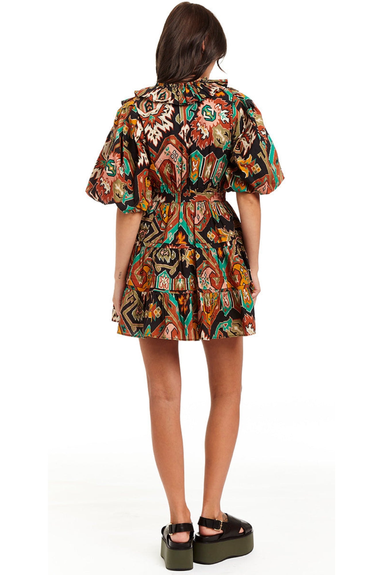 - A Fall update to our Remy Dress - the Marrakech Black Print features olive and rust tones on an ivory ground for the perfect transitional color palette. The Remy Dress is a wrap-tie mini with a ruffled neck and balloon sleeve. Features an internal button and self tie. 100% Cotton Poplin