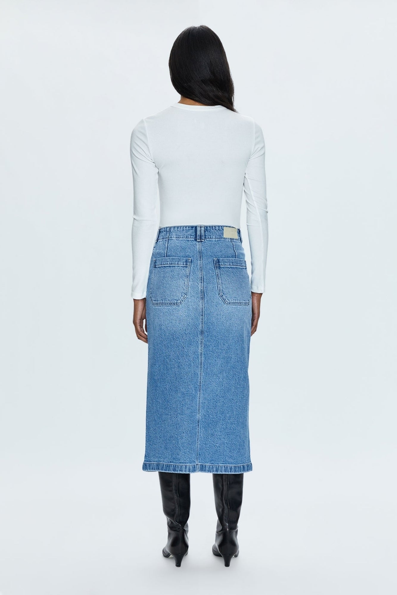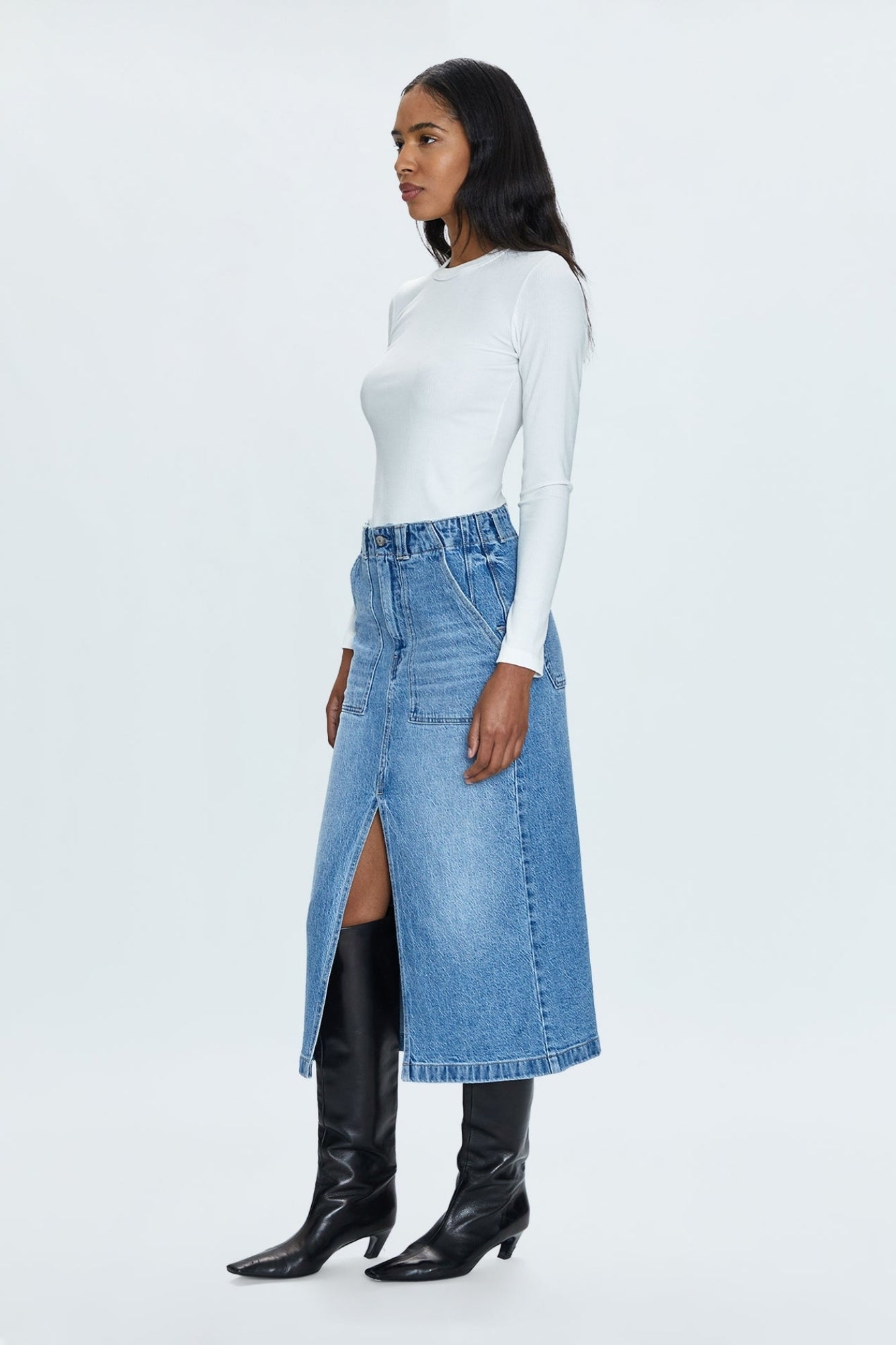 - High rise denim midi skirt crafted from our signature comfort stretch denim.