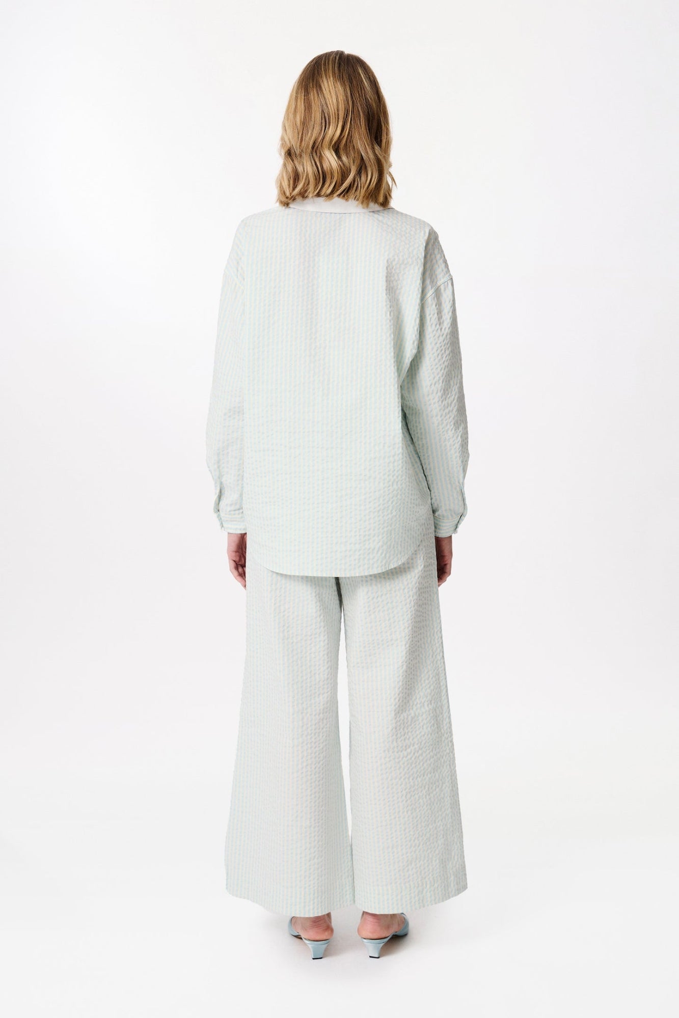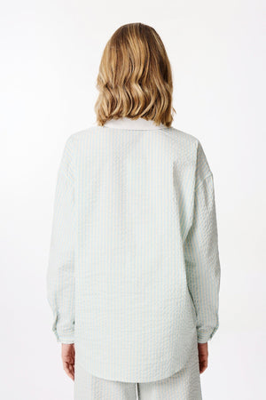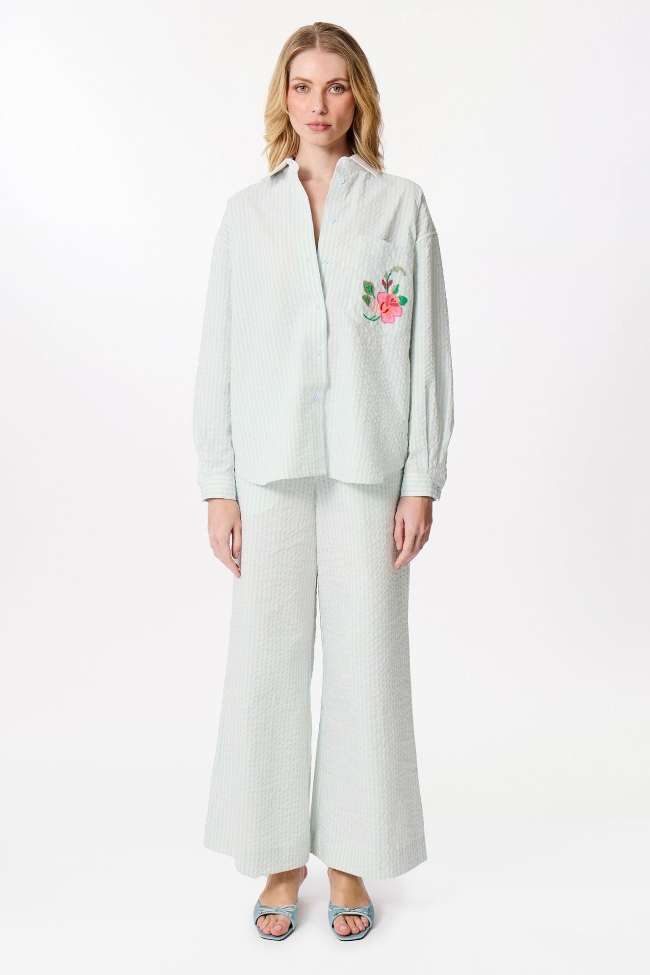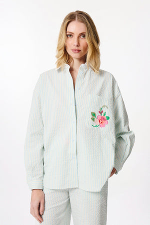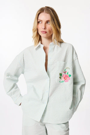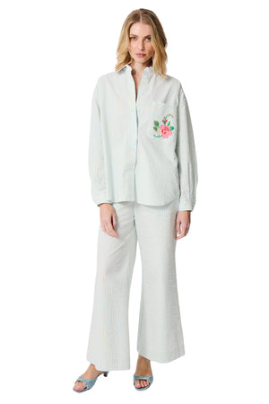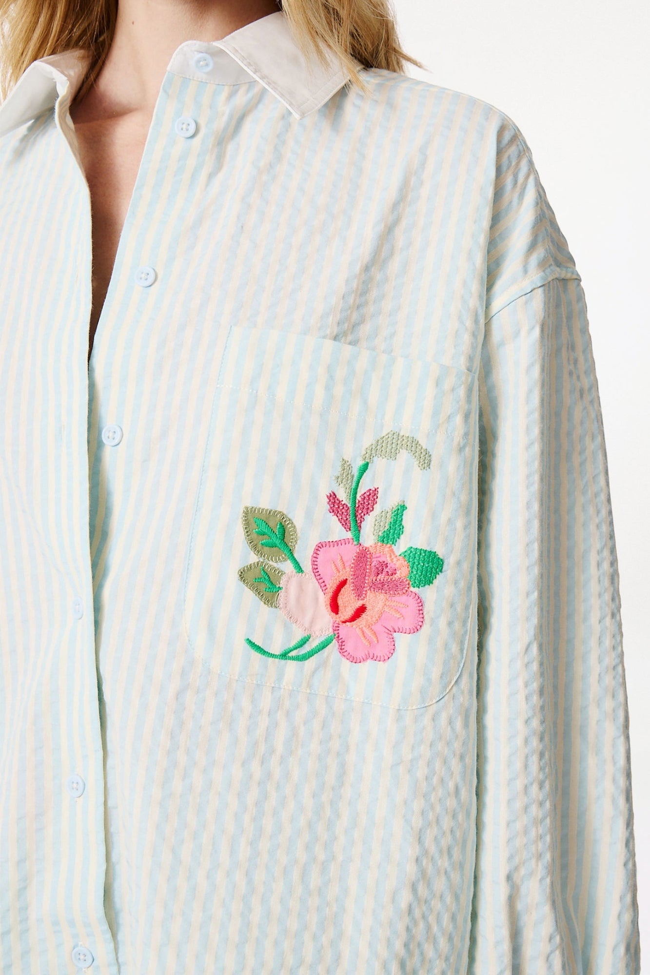 This striped shirt has a classic denim collar and a rose patch on the front. Its loose boy-friend cut gives it a casual chic look.