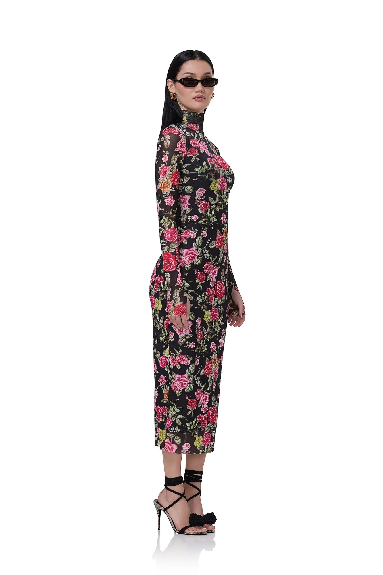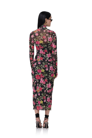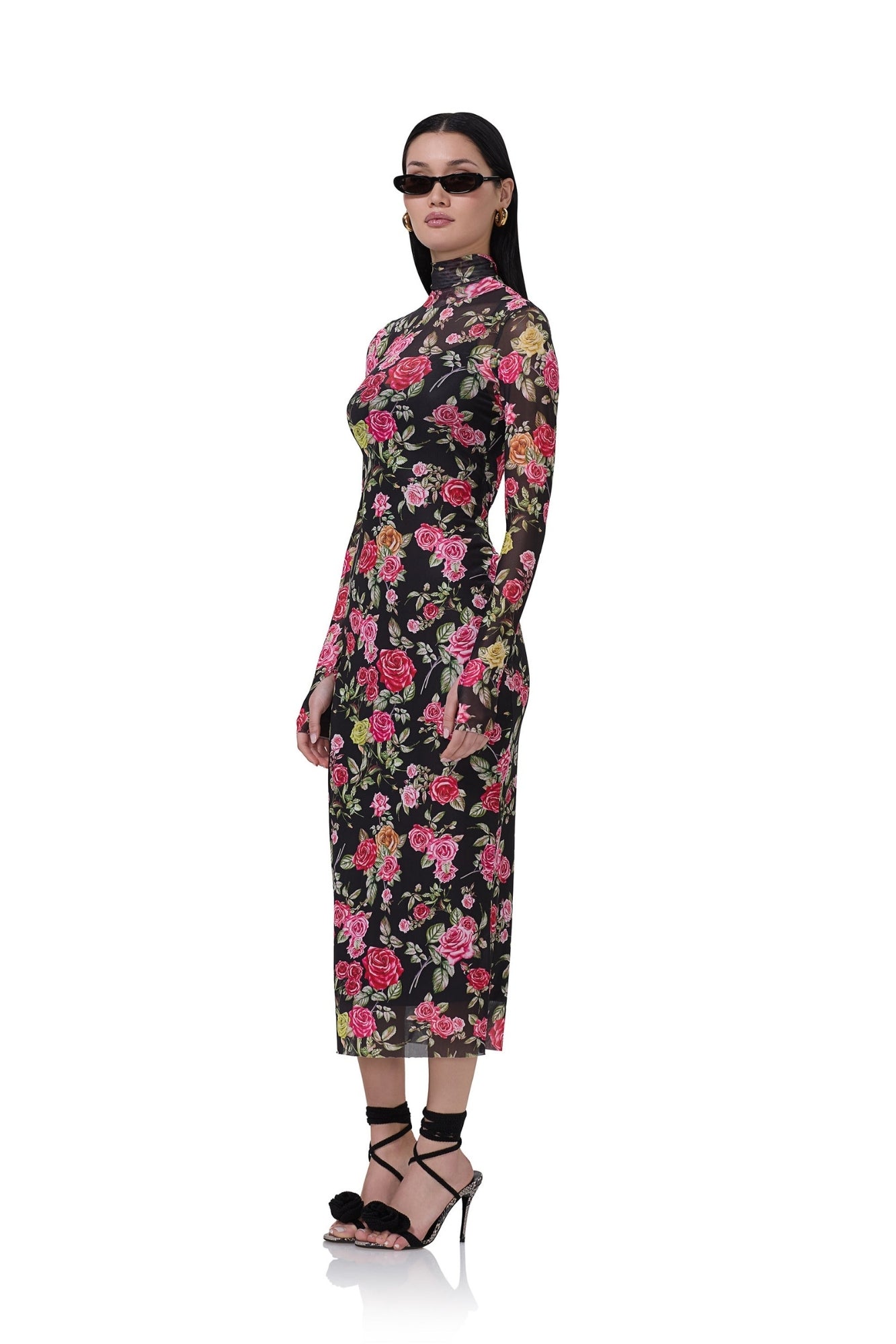 - In a sheer power mesh in Wallpaper Rose, the Shailene dress features a turtleneck and fitted midi silhouette.