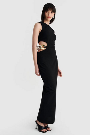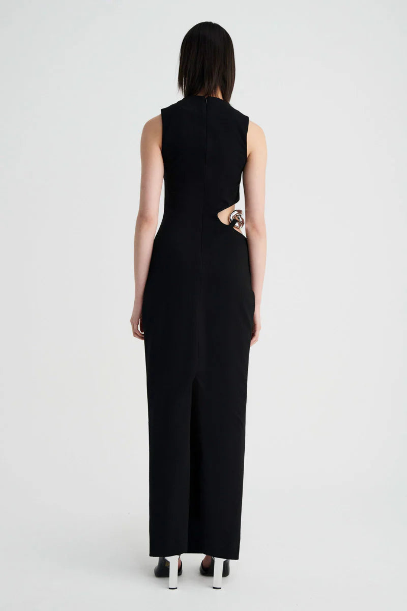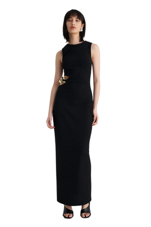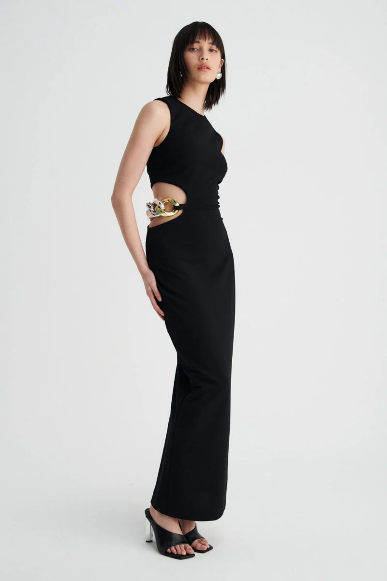 - THE STELLA CHAIN COLUMN DRESS IN BLACK IS CRAFTED FROM A STRETCHY CREPE WITH DOUBLE LINING FOR A LUXURIOUS SOFT FINISH. FEATURING A CHUNKY CHAIN DETAIL, CUT OUT ON THE WAIST LINE, WITH A SLIT AT THE DRESS IS A SOPHISTICATED EVENT STAPLE FOR A CAPSULE WARDROBE.