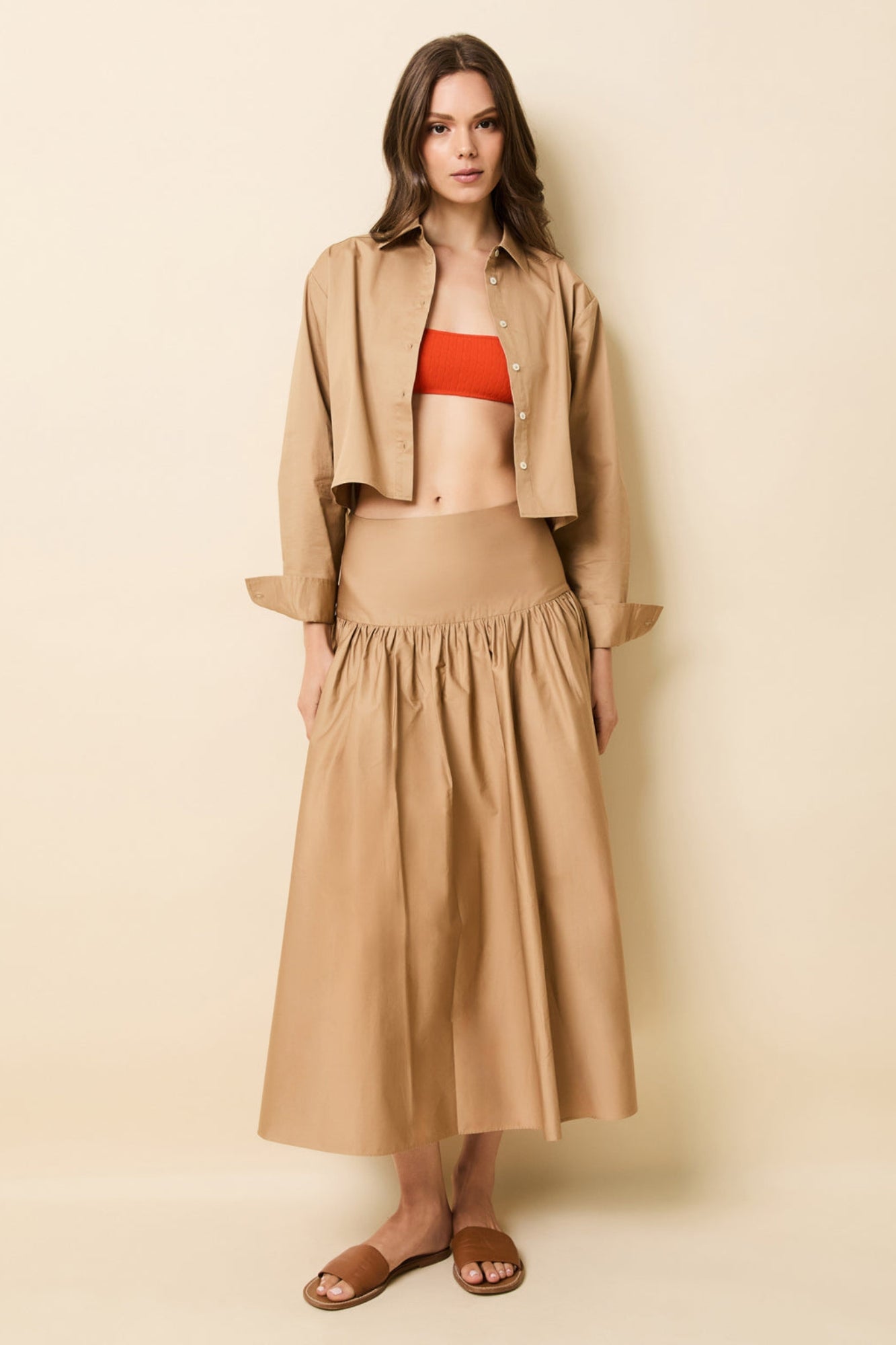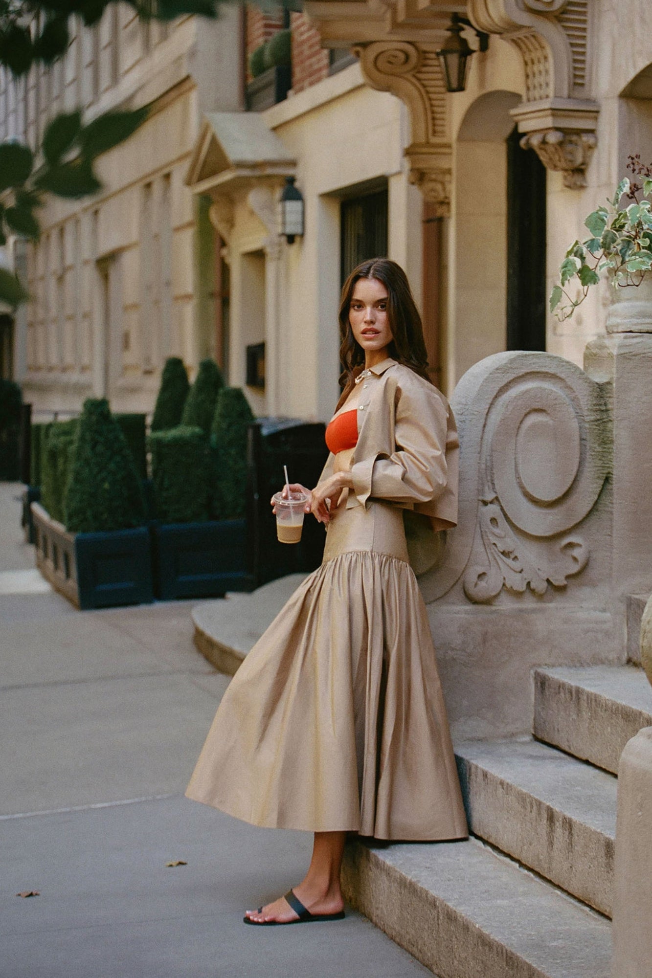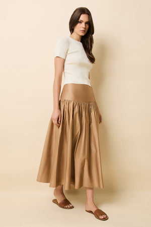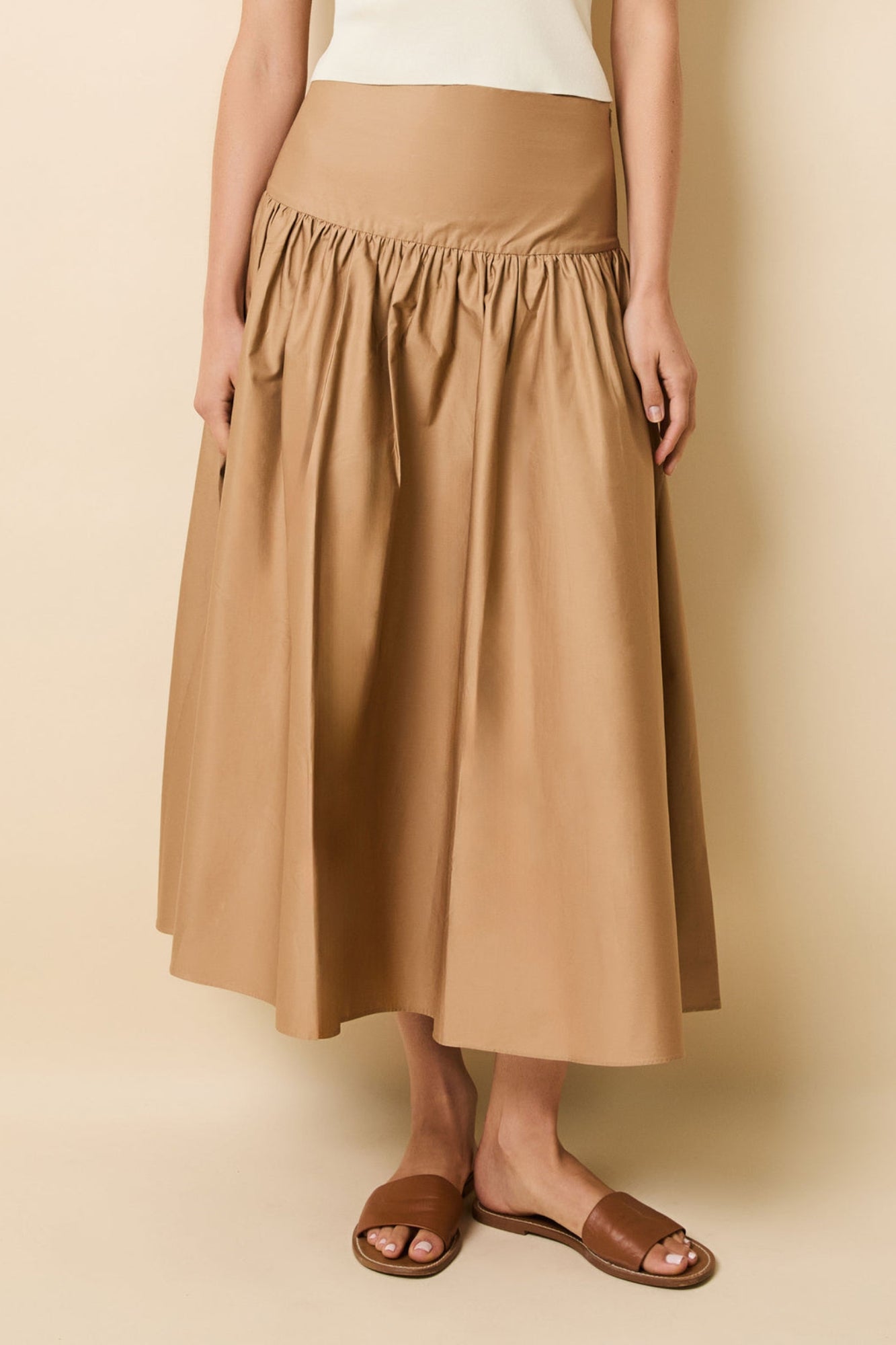 - The A-line silhouette is complemented by a gathered full skirt, offering soft volume and elegant movement with every step.