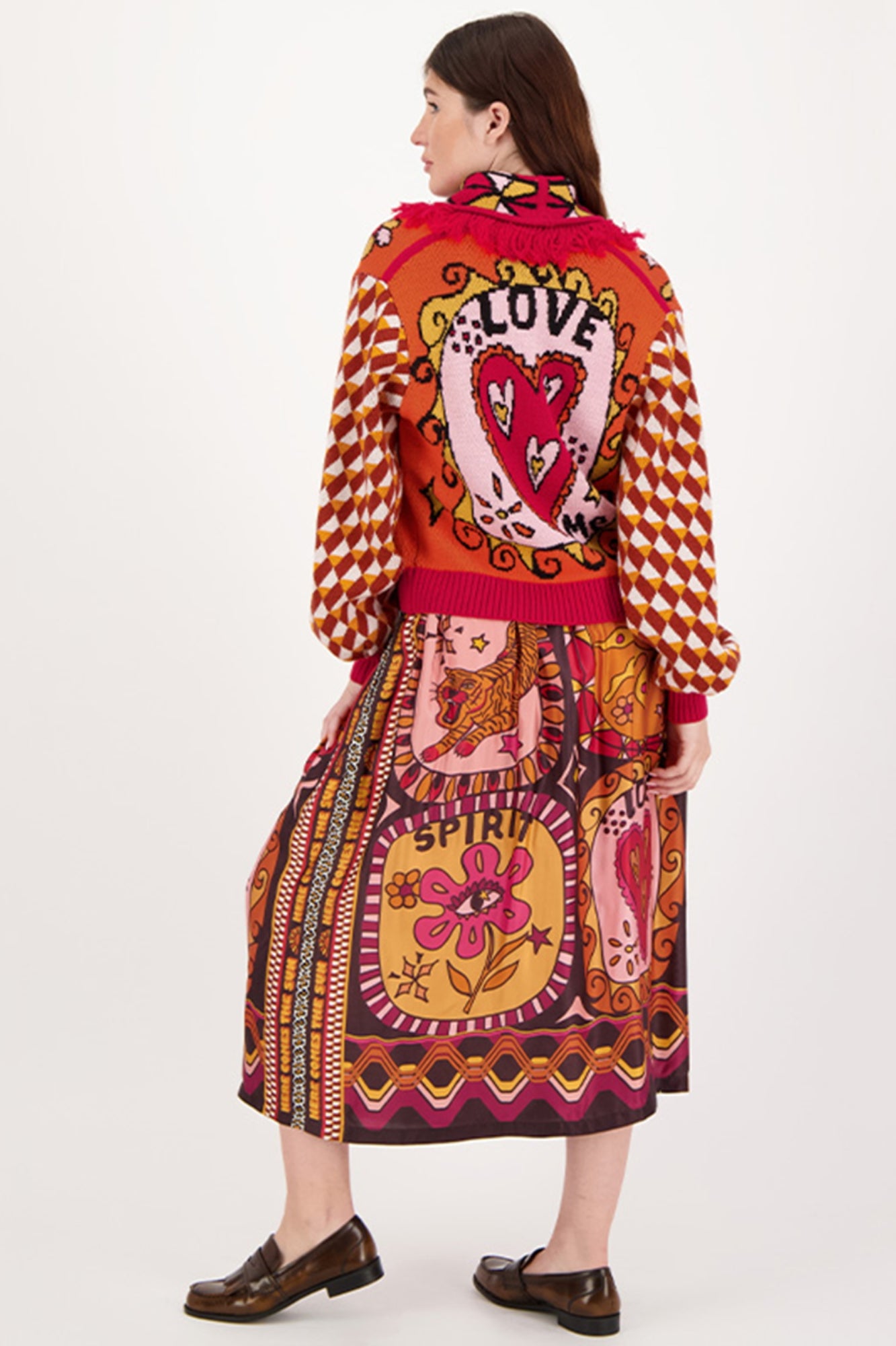 - Elastic waist, flowy, pleated midi skirt in our Sunset pattern gives a 60’s vibe with four large graphics in front that read “FIERCE”, “SPIRIT” (2x) and “LOVE”.