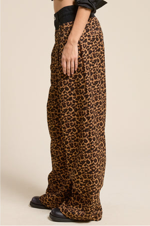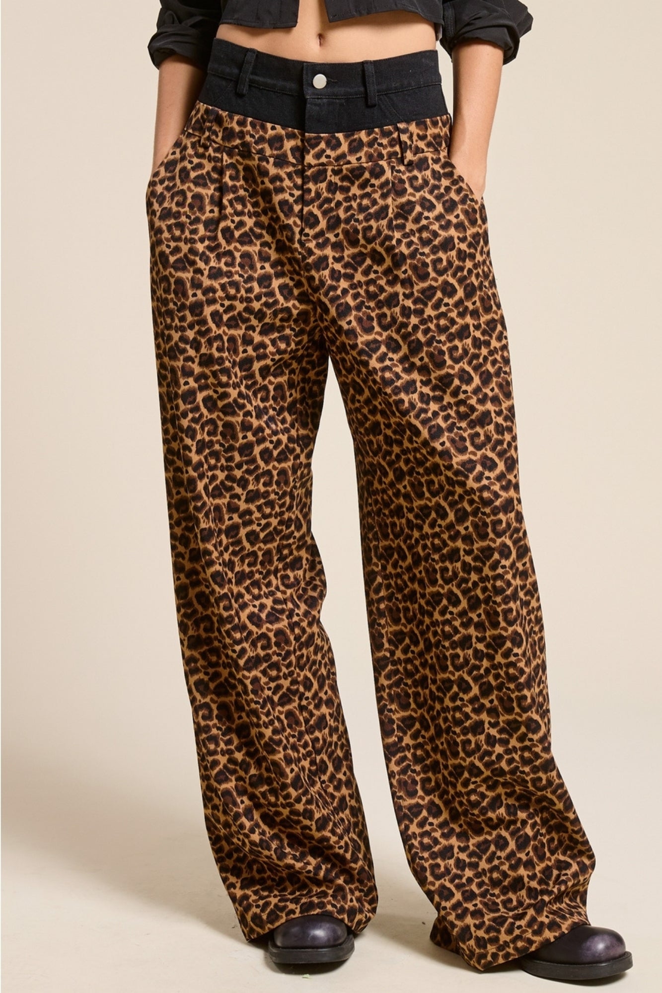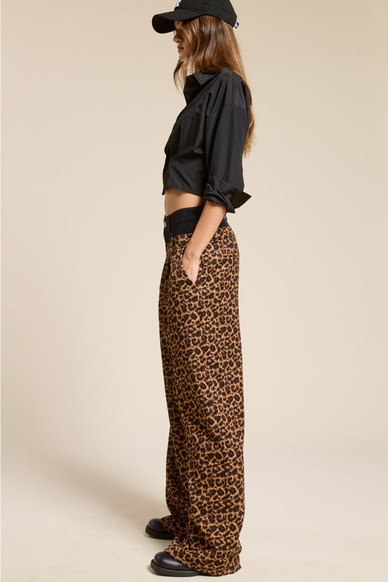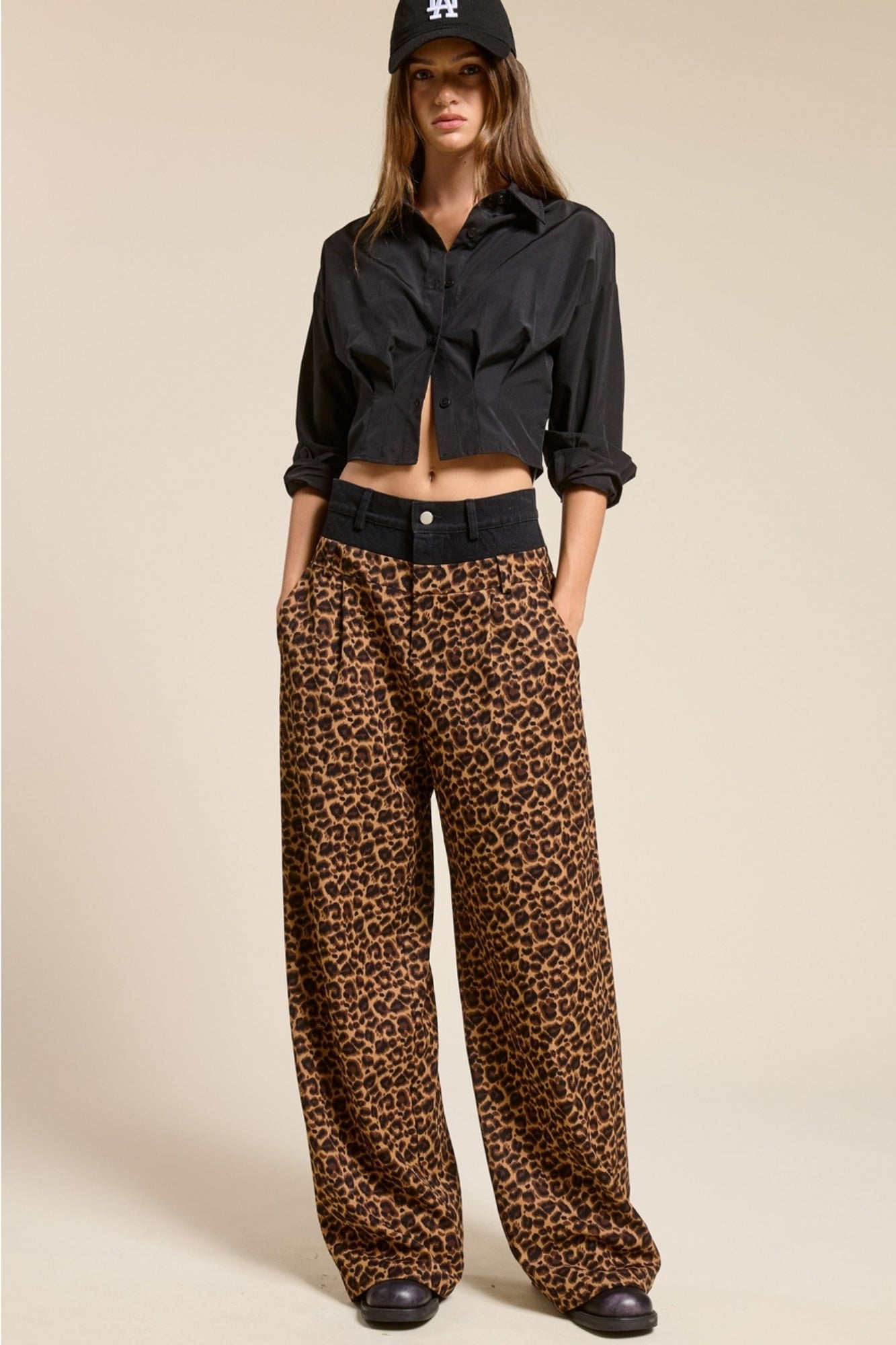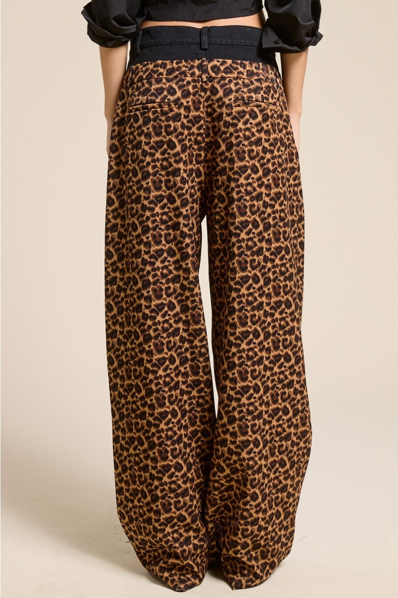 LEOPARD PRINT WIDE LEG PANT WITH DENIM WAIST