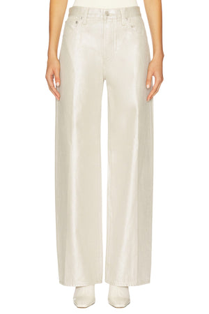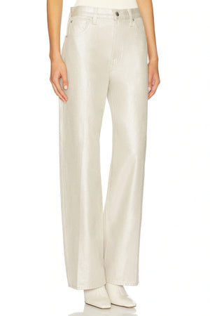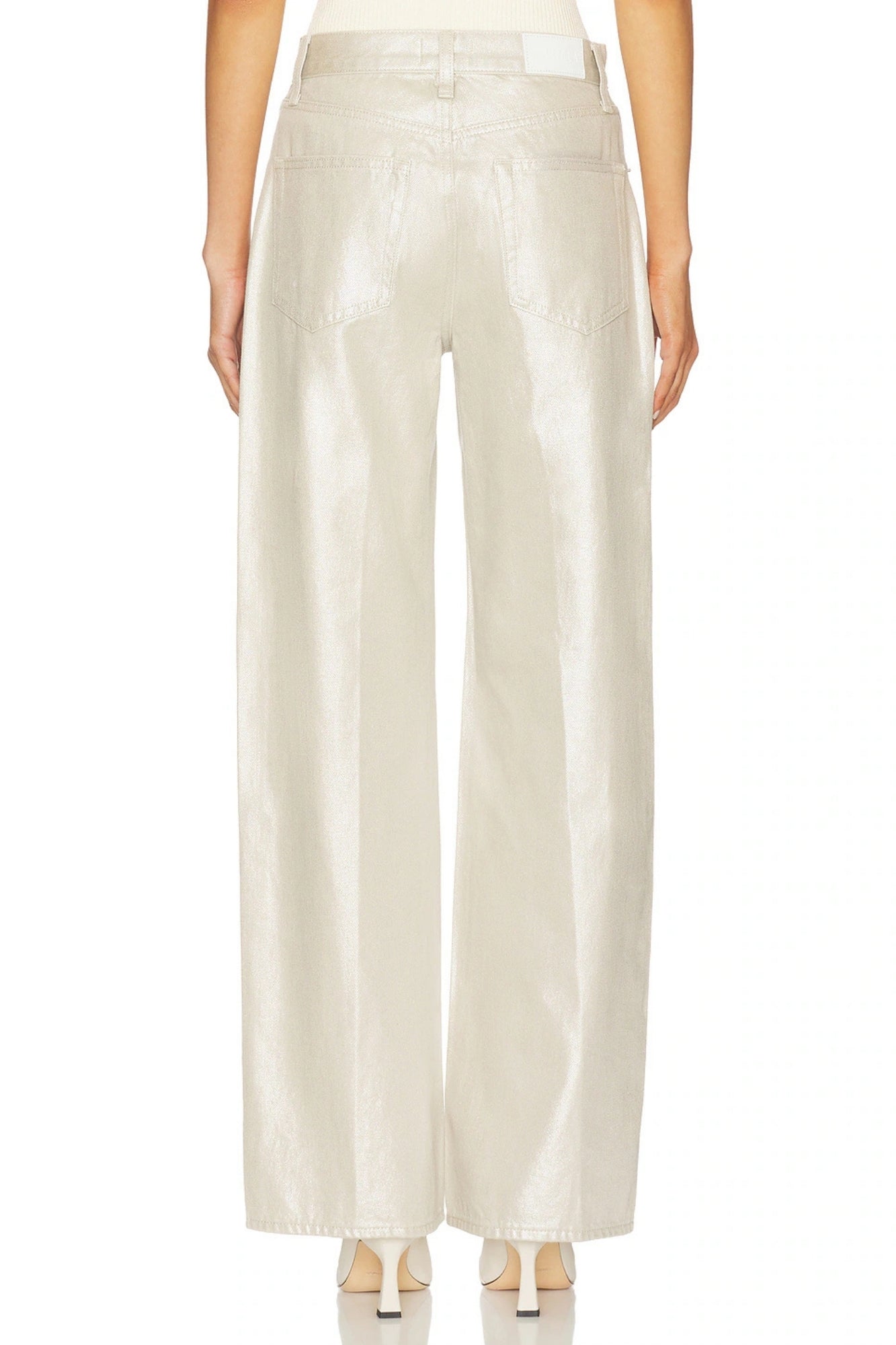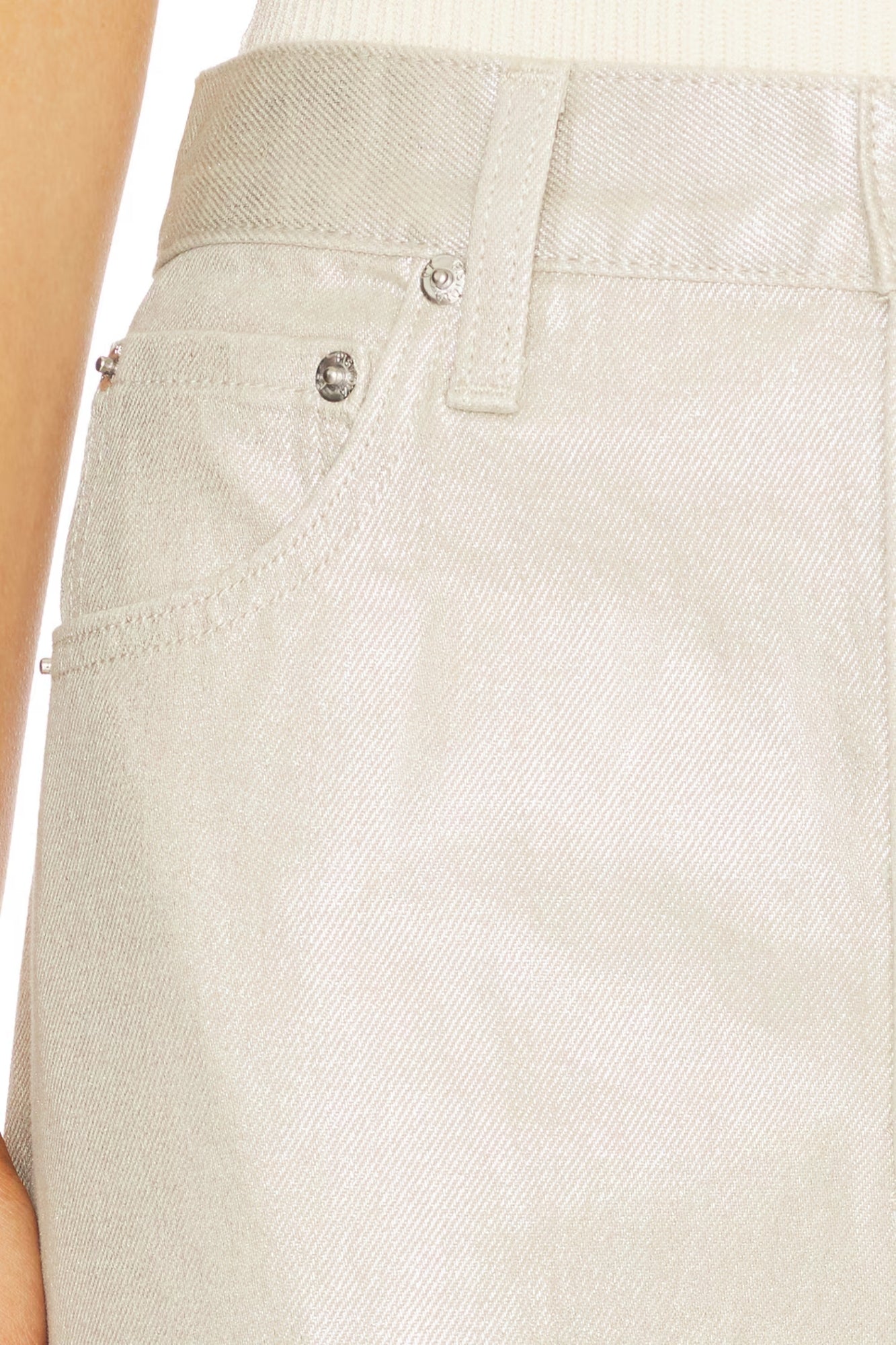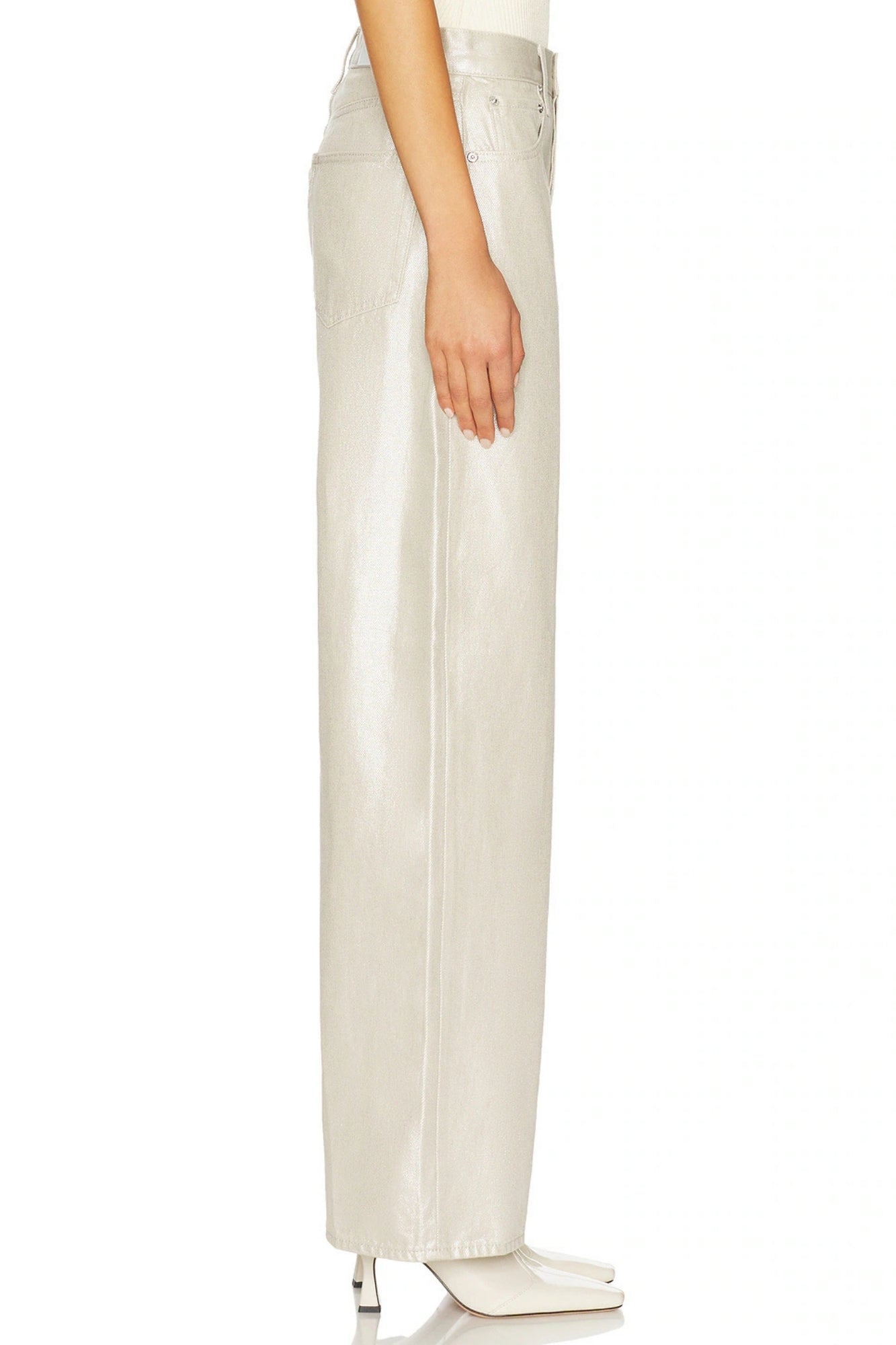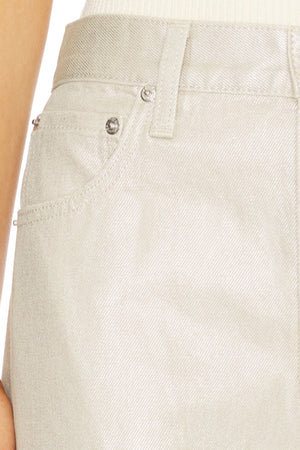 Crafted from 100% cotton non-stretch denim in Champagne Luster, a pearly coated finish that reflects light with every step for an effortlessly elevated look