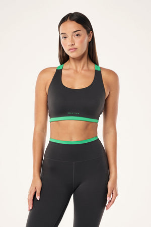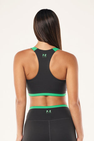 - The Highgate Sports Bra in Caviar & Kelly Green is made from our most lightweight active fabrication, Active Lite, this racer back sports bra features a scoop neckline, removable cups and concealed elastic at underbust for added support.